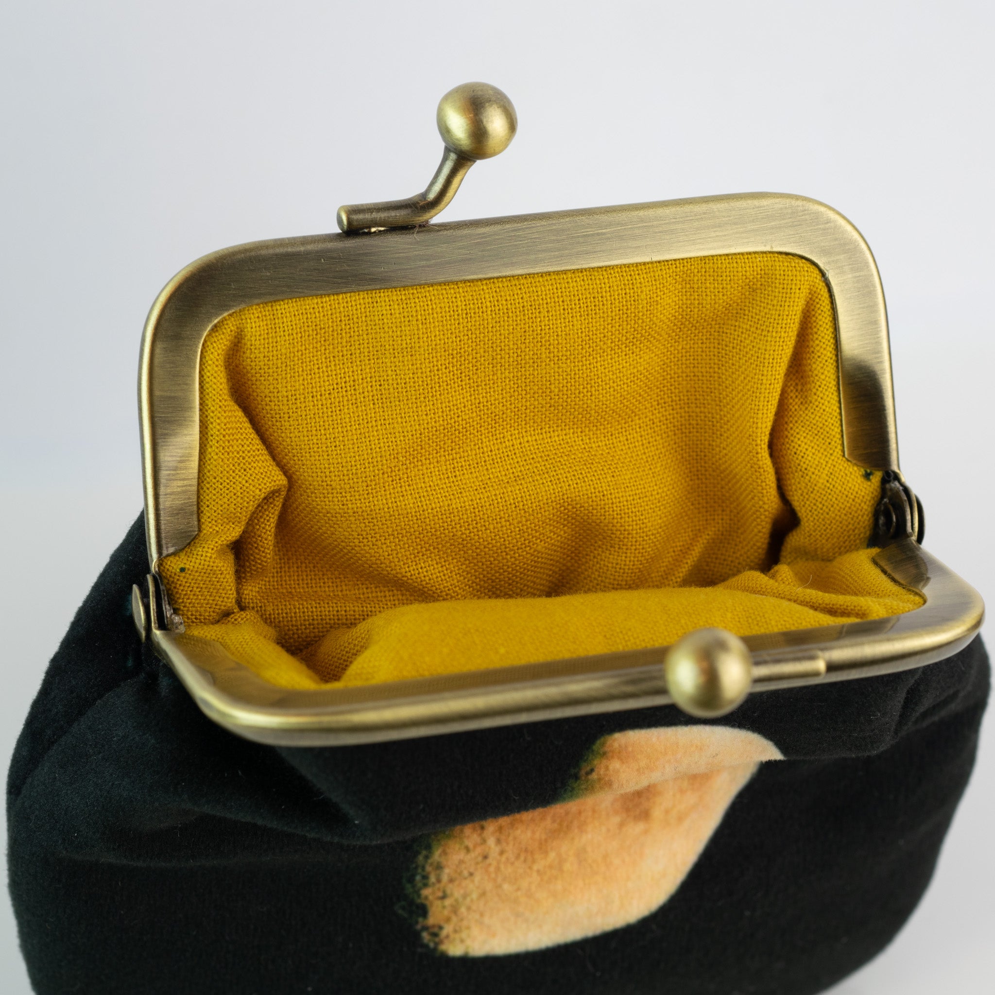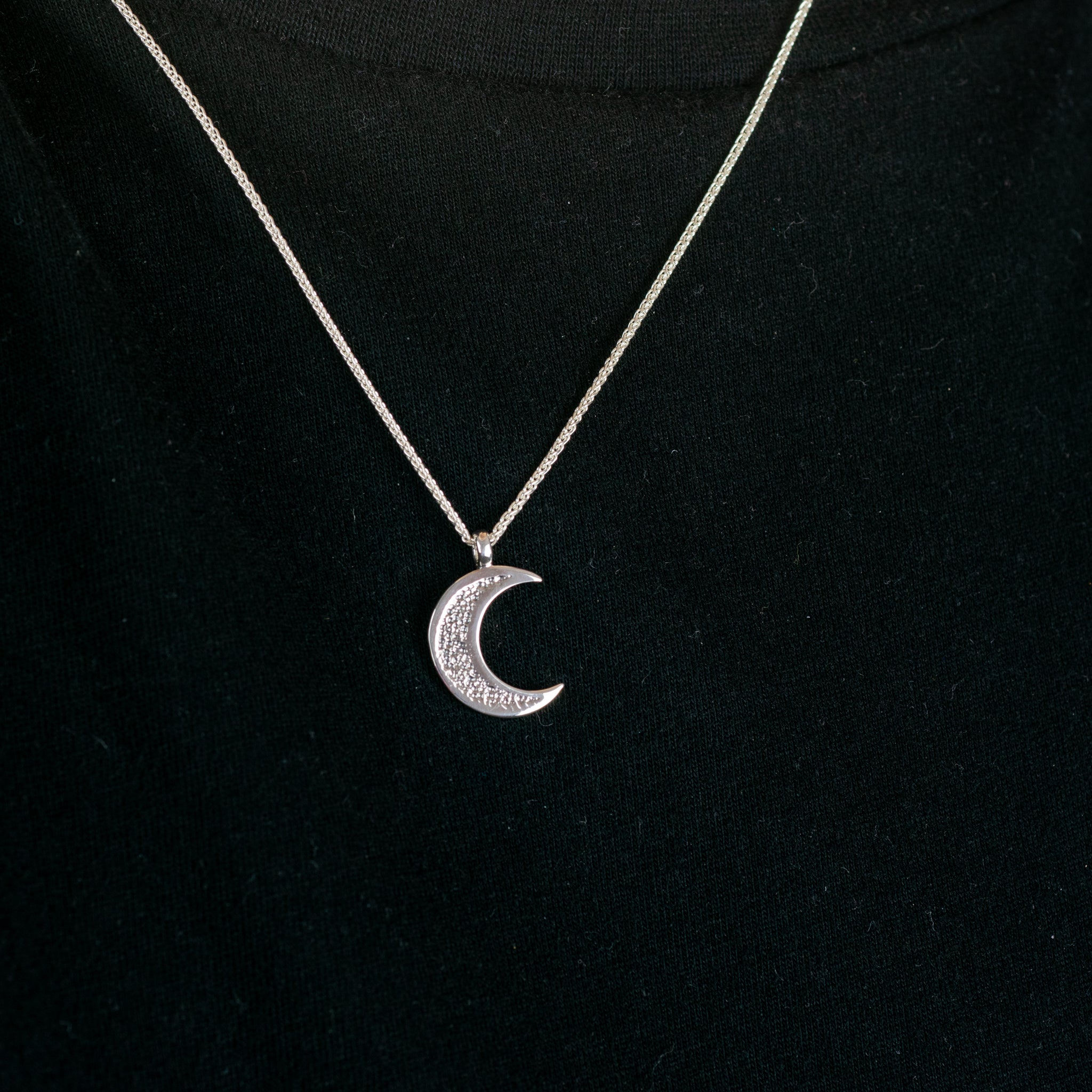 We’ve paired our timeless sterling silver moon pendant with a beautiful kiss-lock purse, crafted from deep black velvet and adorned with a soft moon, lined in golden yellow cotton like a pocketful of starlight.
