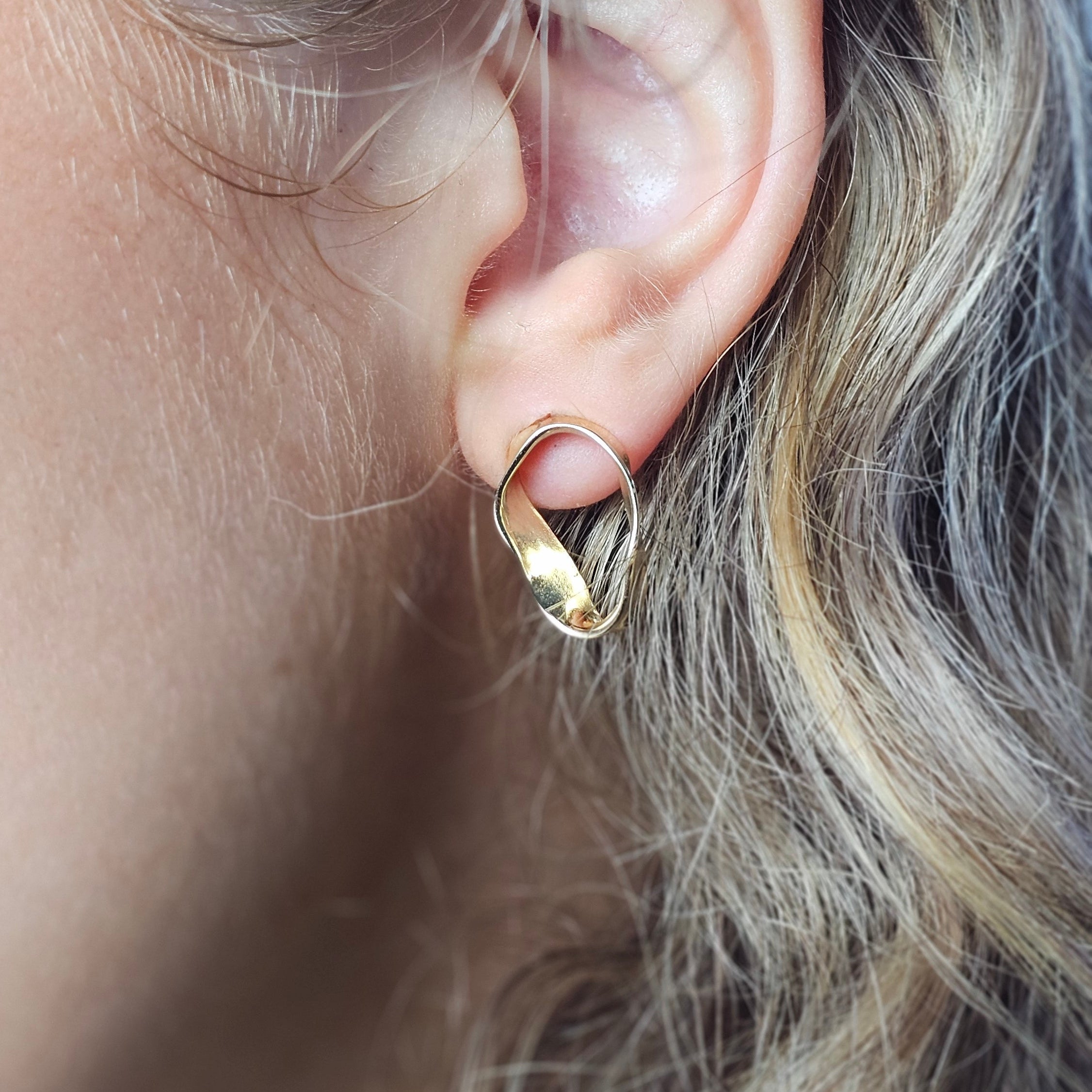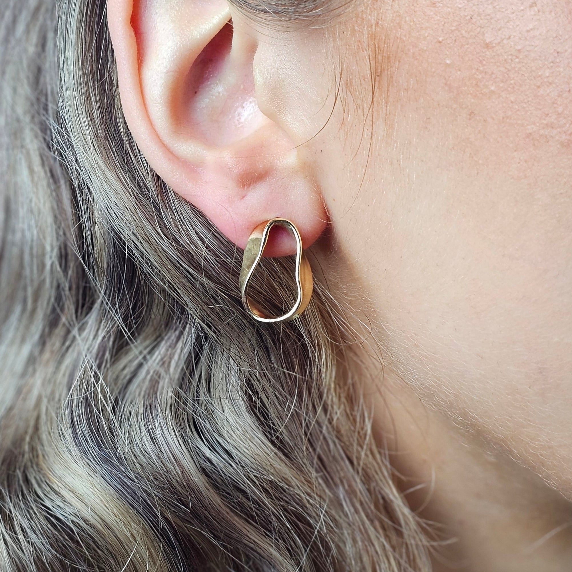 Glimmerings solid gold studs, crafted from recycled 9ct yellow gold and shaped into organic rounded forms. Their softly twisted contours echo the shifting shapes and gentle shimmer of sunlight drifting over the sand in Orkney’s shallow shoreline waters.