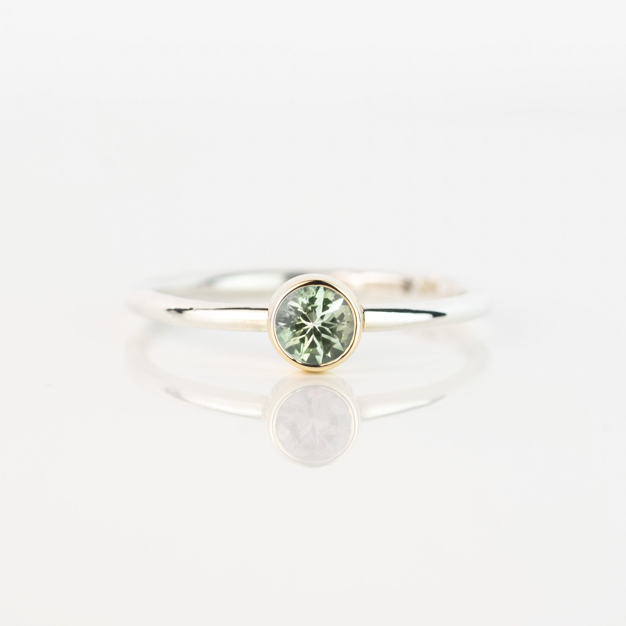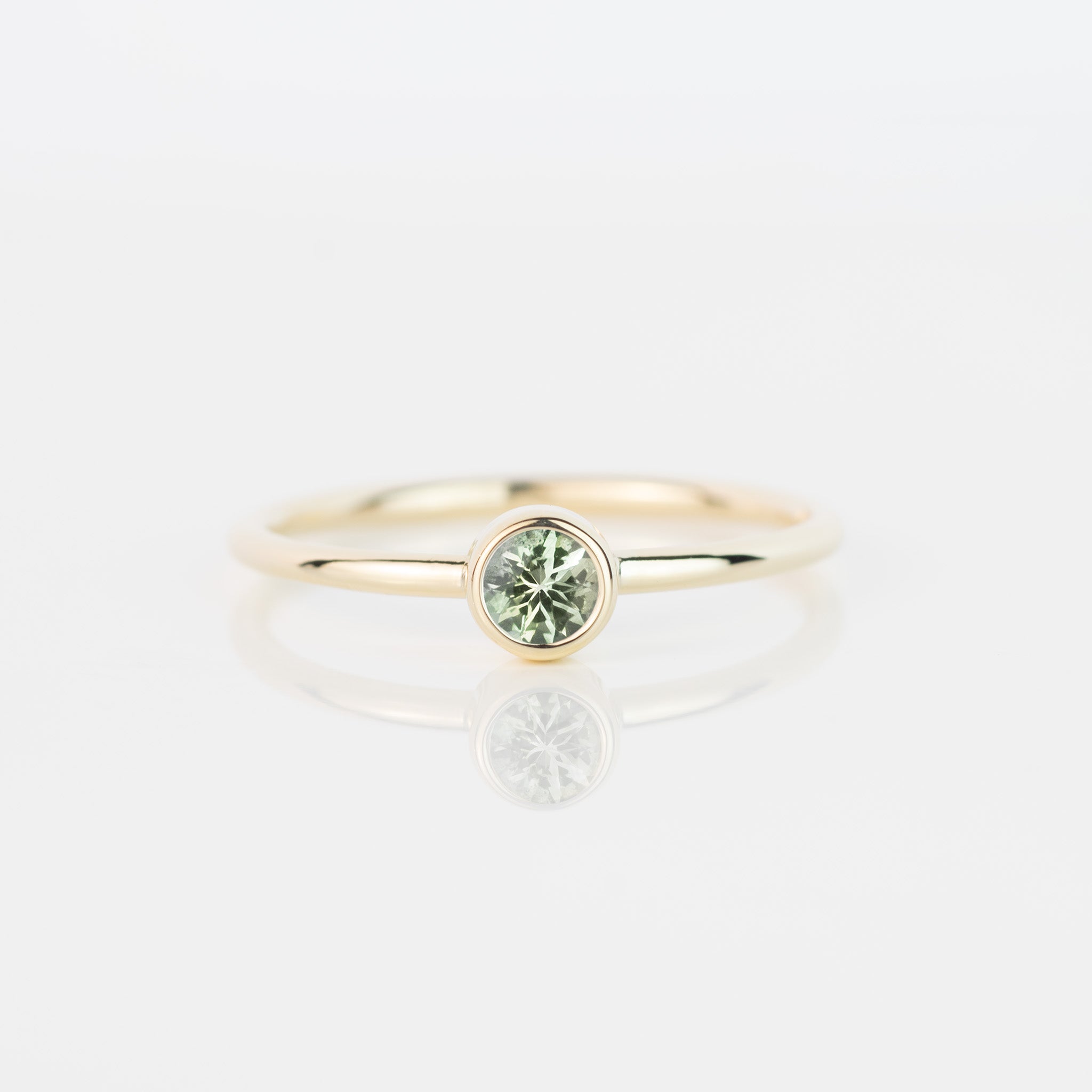 The light green gemstone can be worn on it's own or stacked with others to create a unique stacking ring set. Green sapphire is one of the birthstones of September and signifies tranquillity.