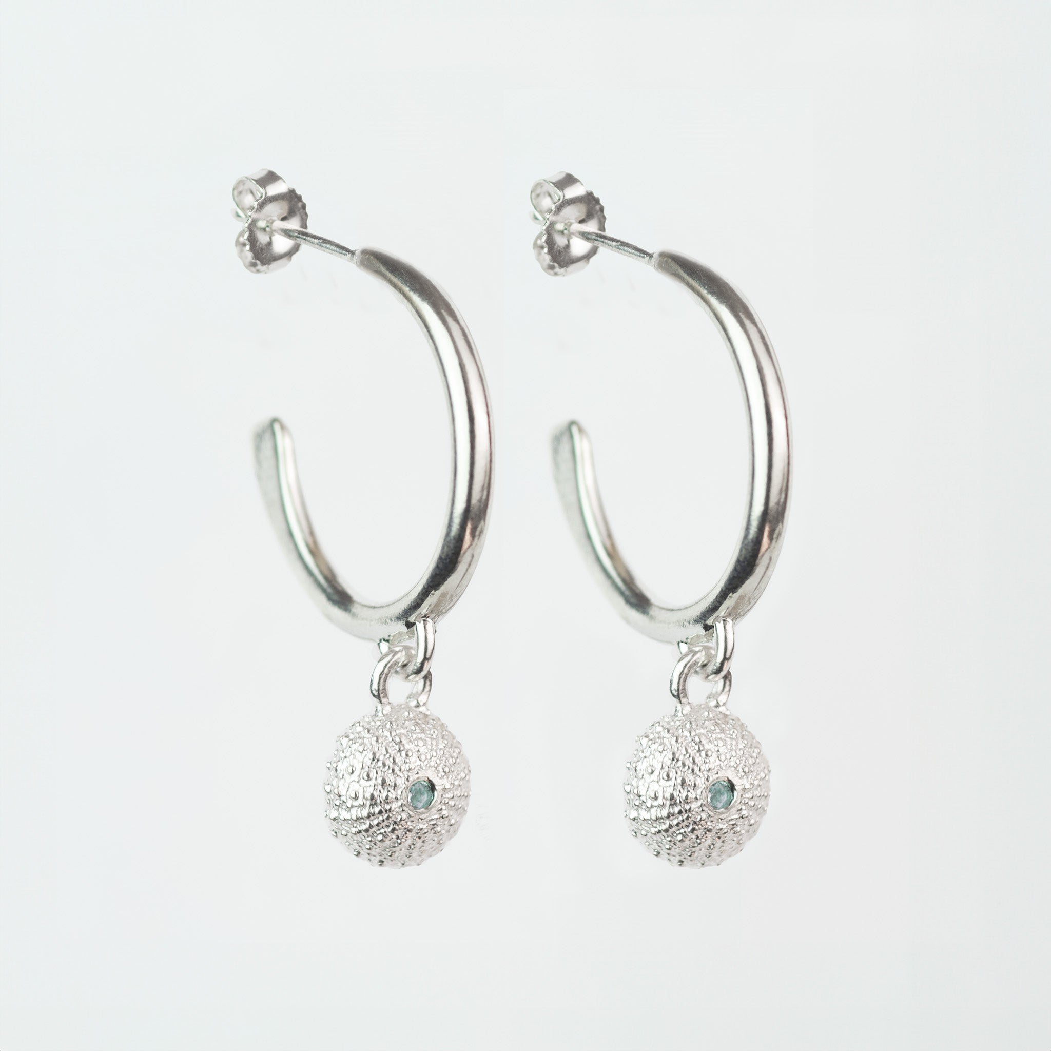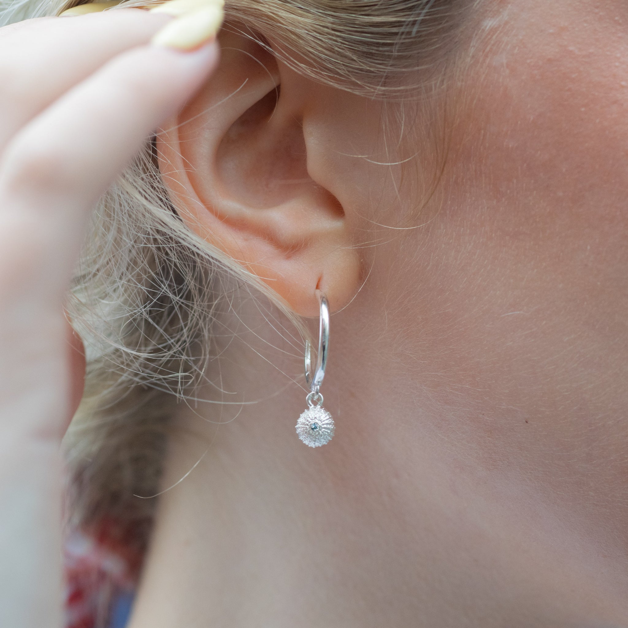 These adorable sterling silver hoop earrings showcase delicate sea urchin charms inspired by the Orkney coastline. Tiny shells with fine detailing swing gently from classic hoops, bringing a whimsical splash of the seaside wherever you go. Each urchin is adorned with shimmering aquamarine stones, adding a touch of ocean sparkle to your everyday adventures.