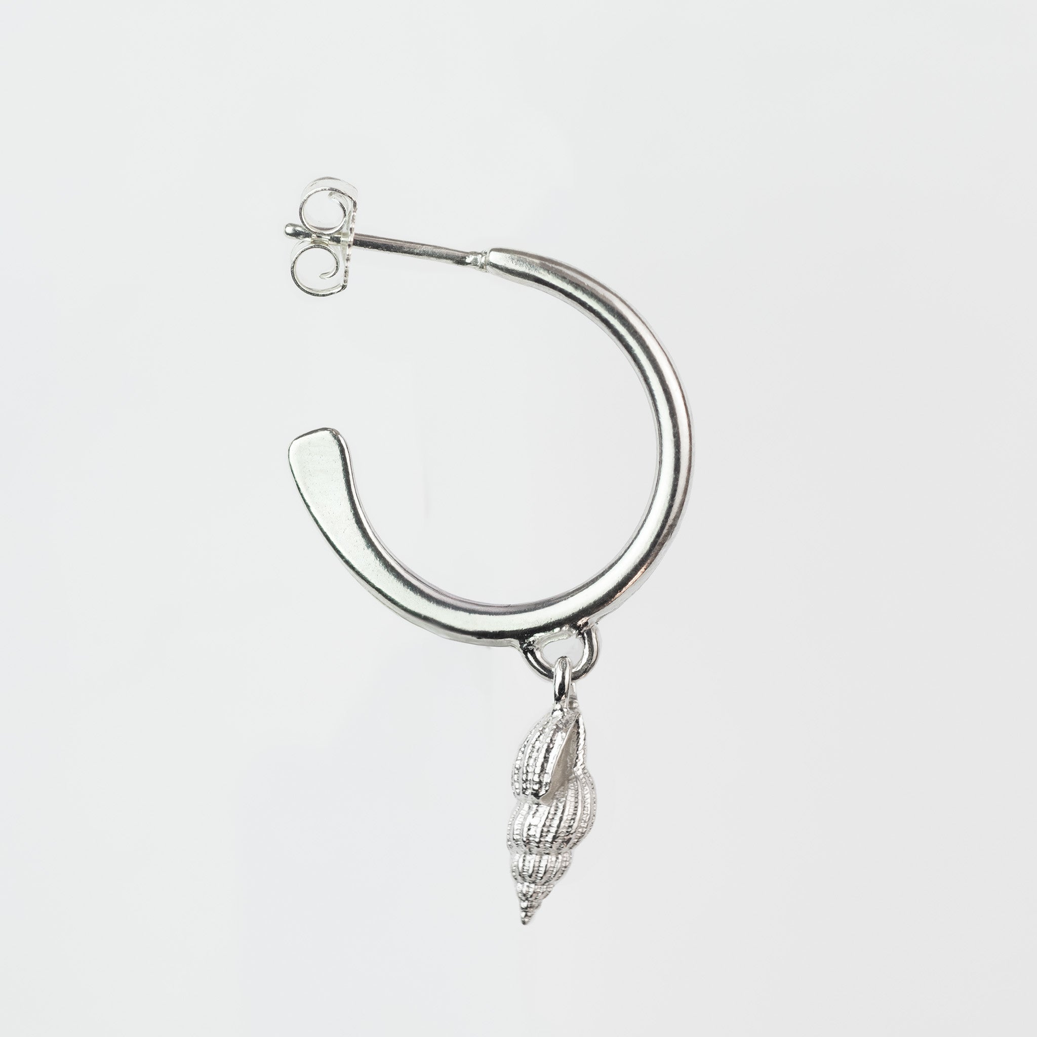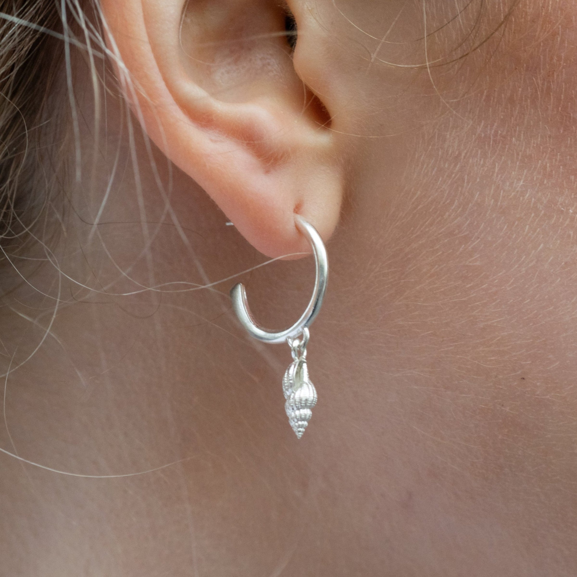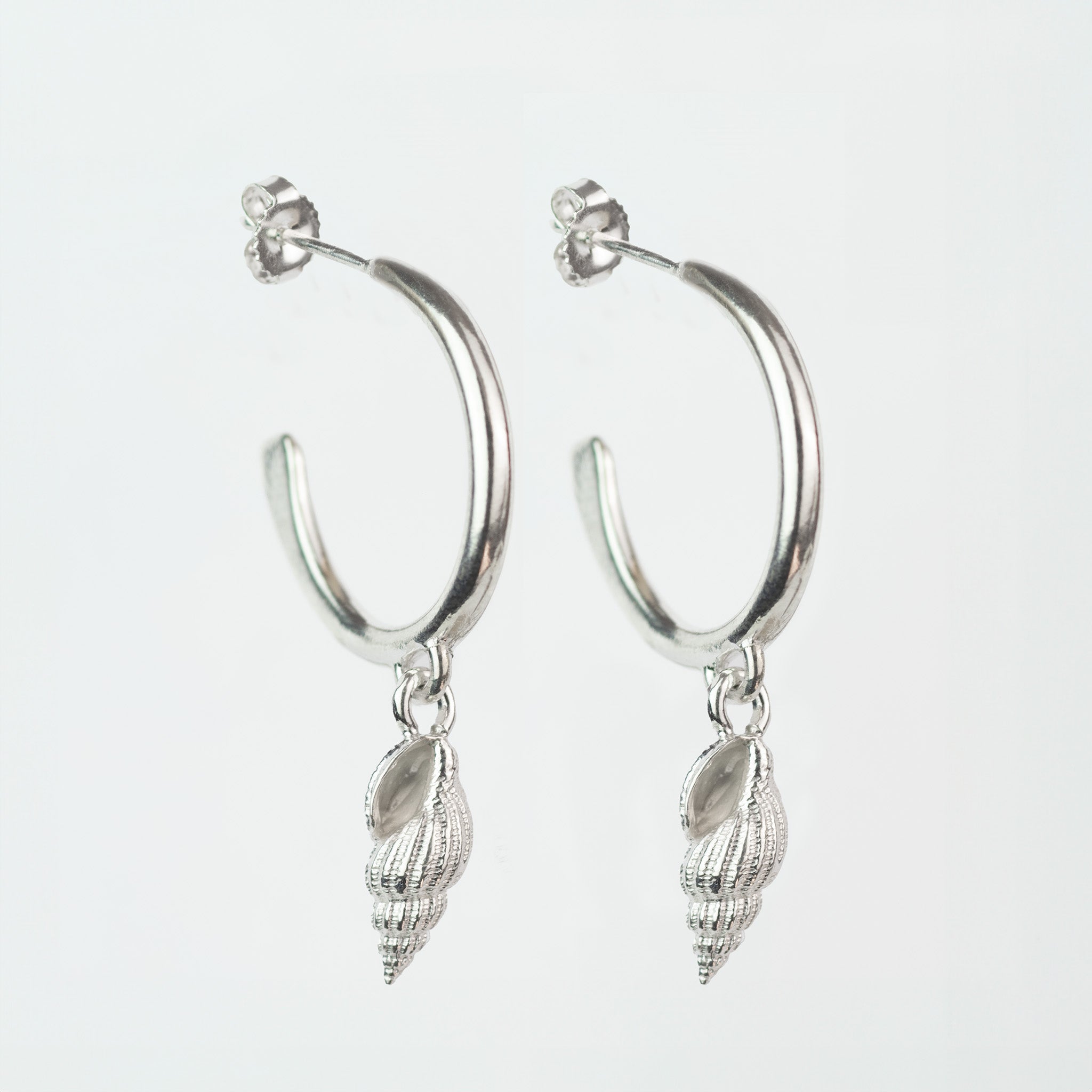 These solid sterling silver whelk hoop earrings feature small shell charms that adds a refined, coastal touch. Perfectly blending subtlety with elegance, they offer a timeless way to carry a piece of the beach with you.