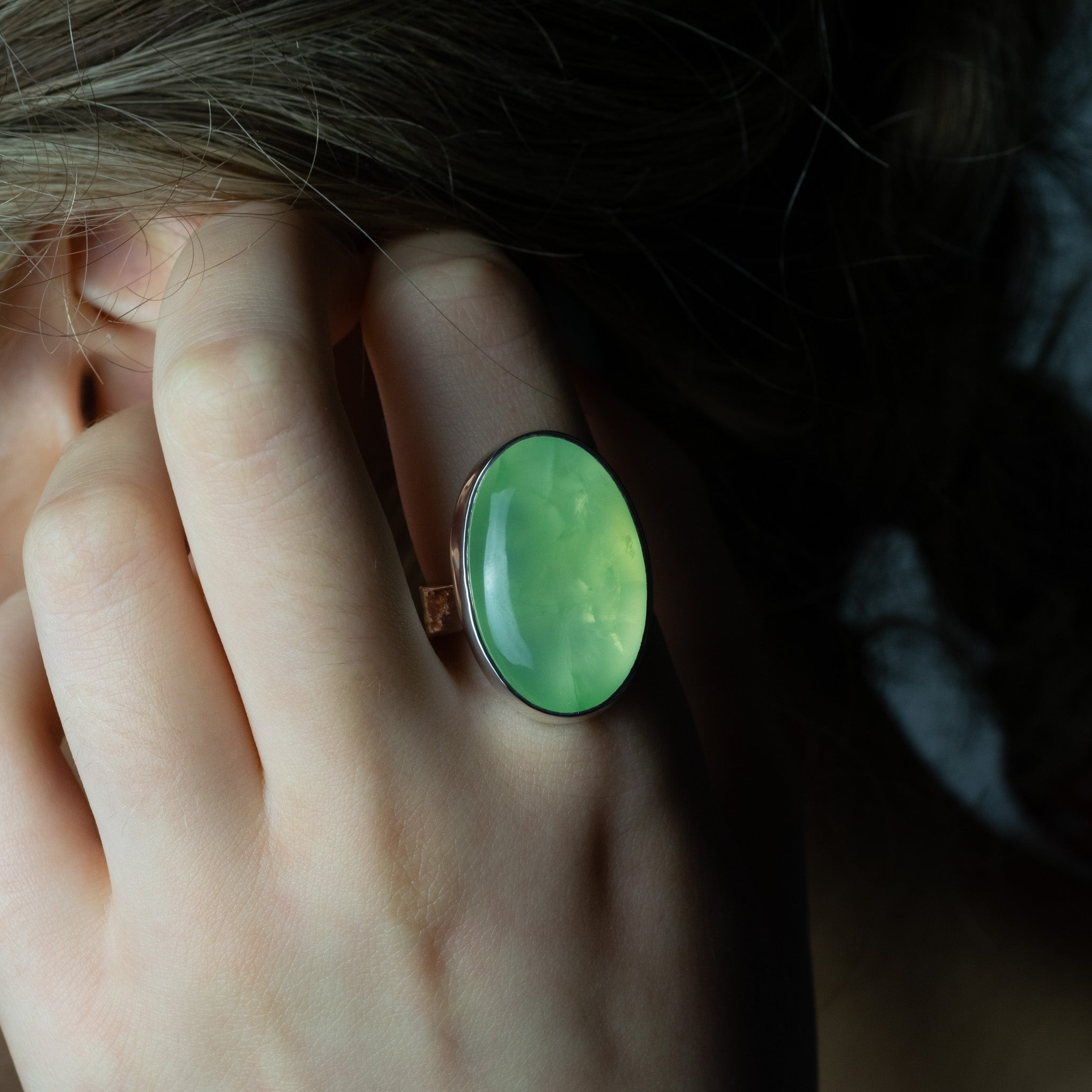Beautifully handmade one of a kind ring, set with a prehnite gemstone.