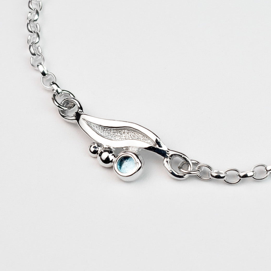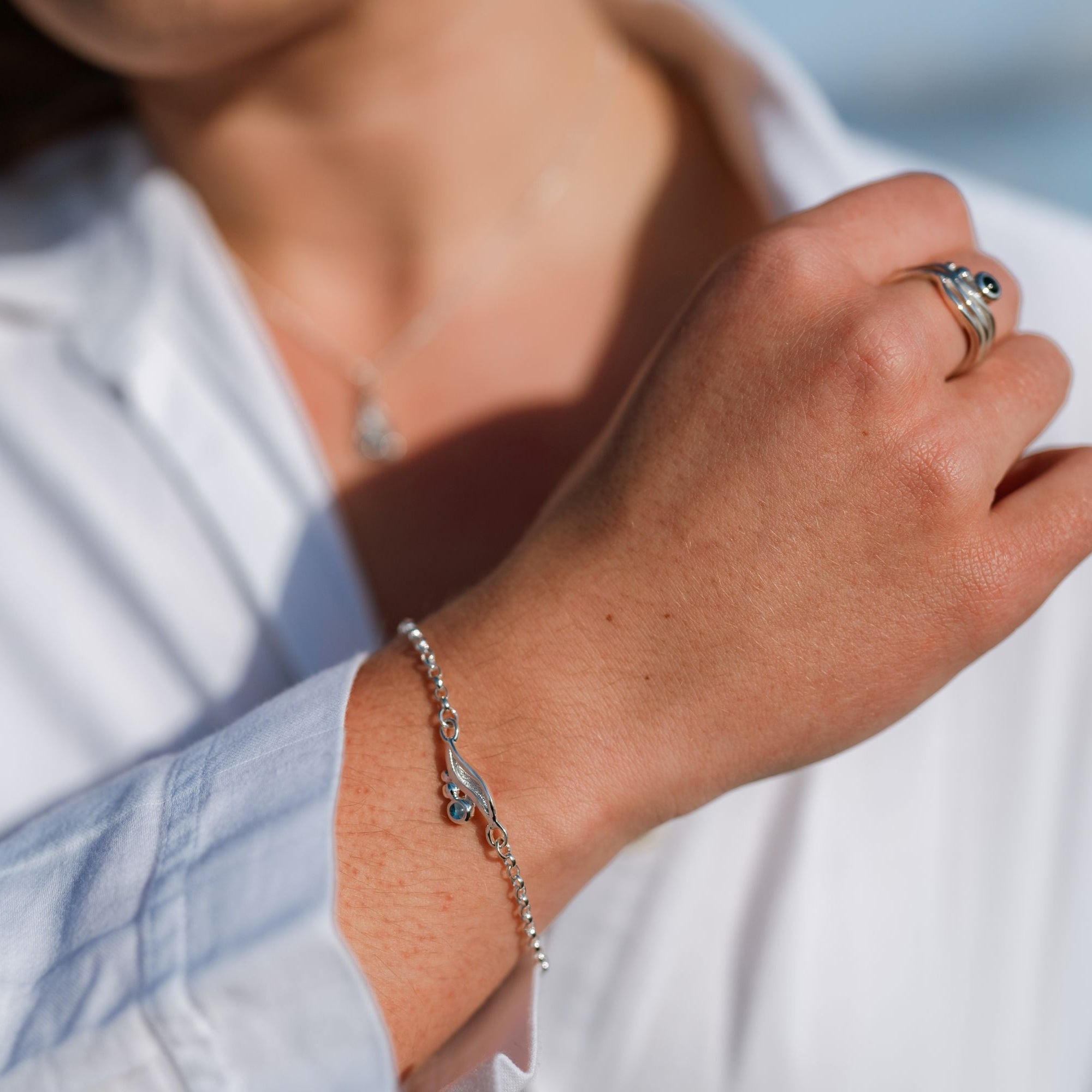 Inspired by the ocean's gentle transformation, this sterling silver bracelet captures the magic of a ripple becoming a mighty wave. At its heart sits a sculpted silver wave adorned with smooth pebbles and a smooth blue topaz stone, flanked by delicate chain links on either side.