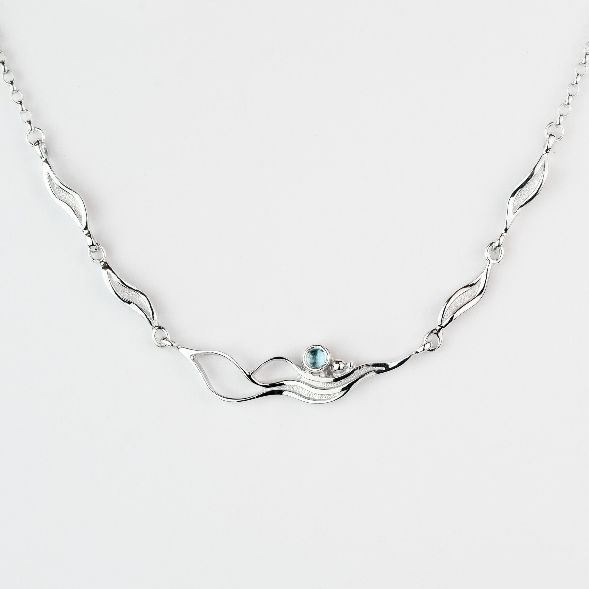 Watch this delightful silver necklet transform from whisper-soft ripples into a glorious wave, just like the Orkney seas that inspired it. Flowing wave links sculpted with playful detail cradle smooth pebbles and brilliant blue topaz, creating movement and sparkle with every wear.
