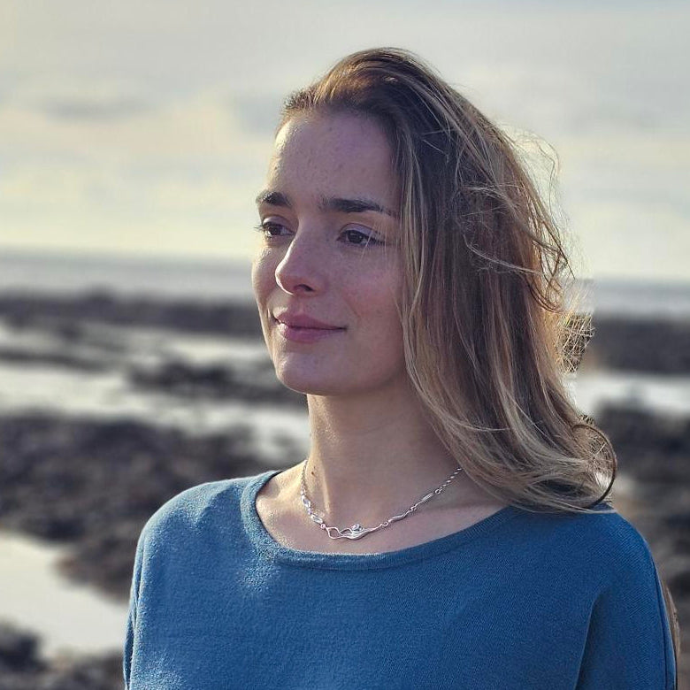Sterling silver chains frame either end, completing this ocean-born treasure. Handcrafted from recycled silver in our island workshop, it's part of the Ripple to Roar collection - a spirited reminder that mighty things start small. Perfect for anyone who hears the sea's call and celebrates its understated power.