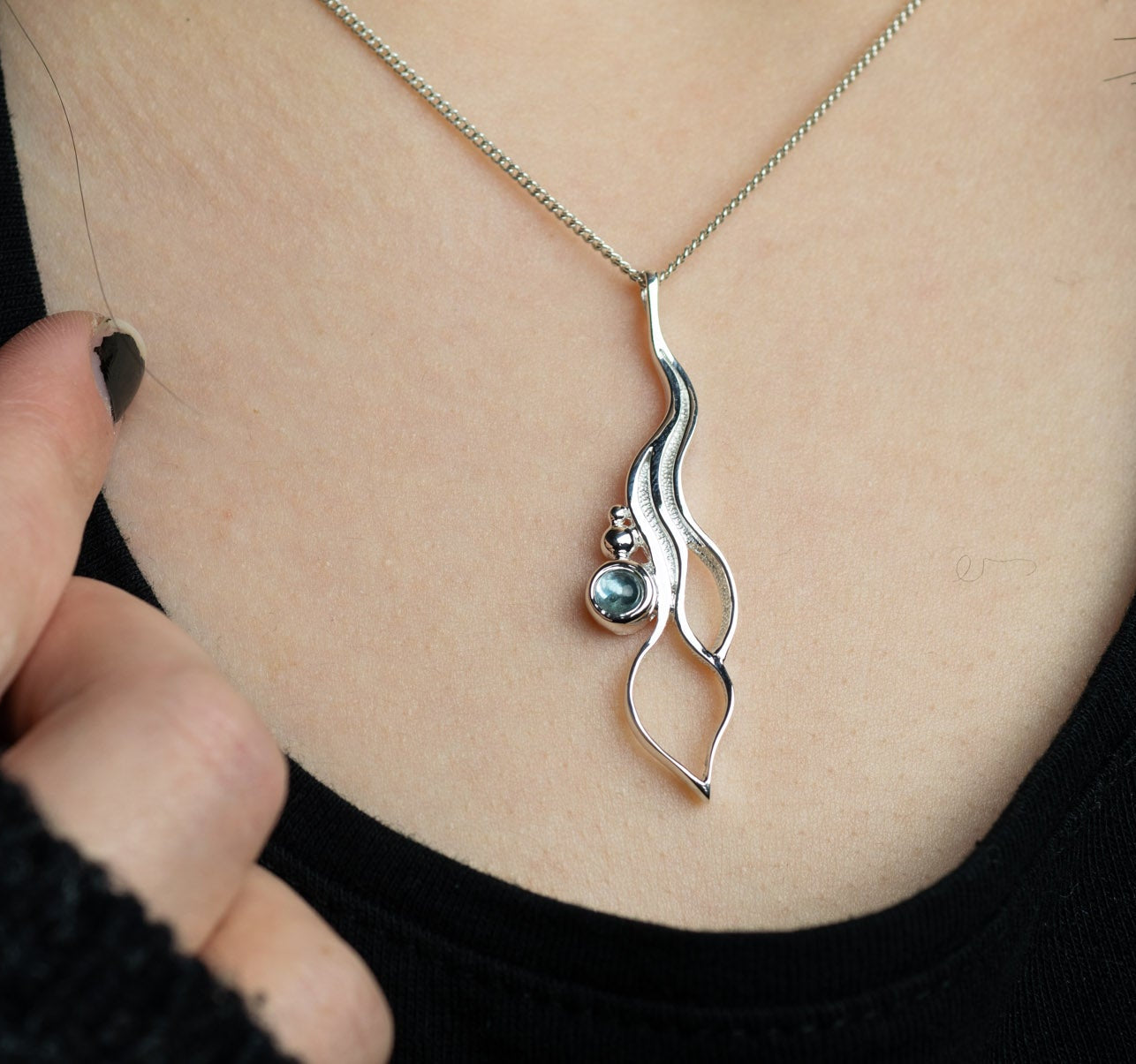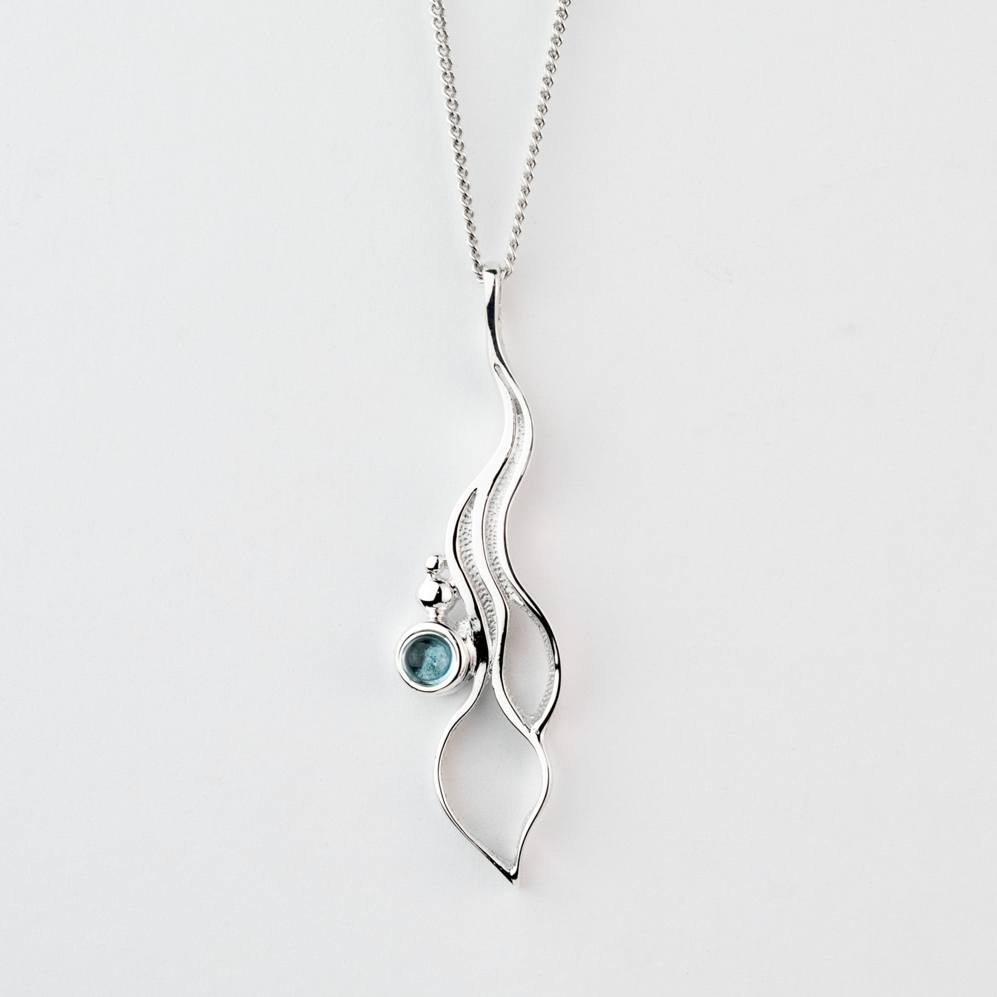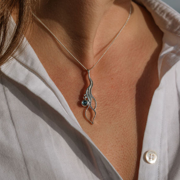 Inspired by the natural rhythm of the sea, the Ripple to Roar pendant features a sculpted wave finished with rolling pebbles and a beautiful blue topaz gemstone.
