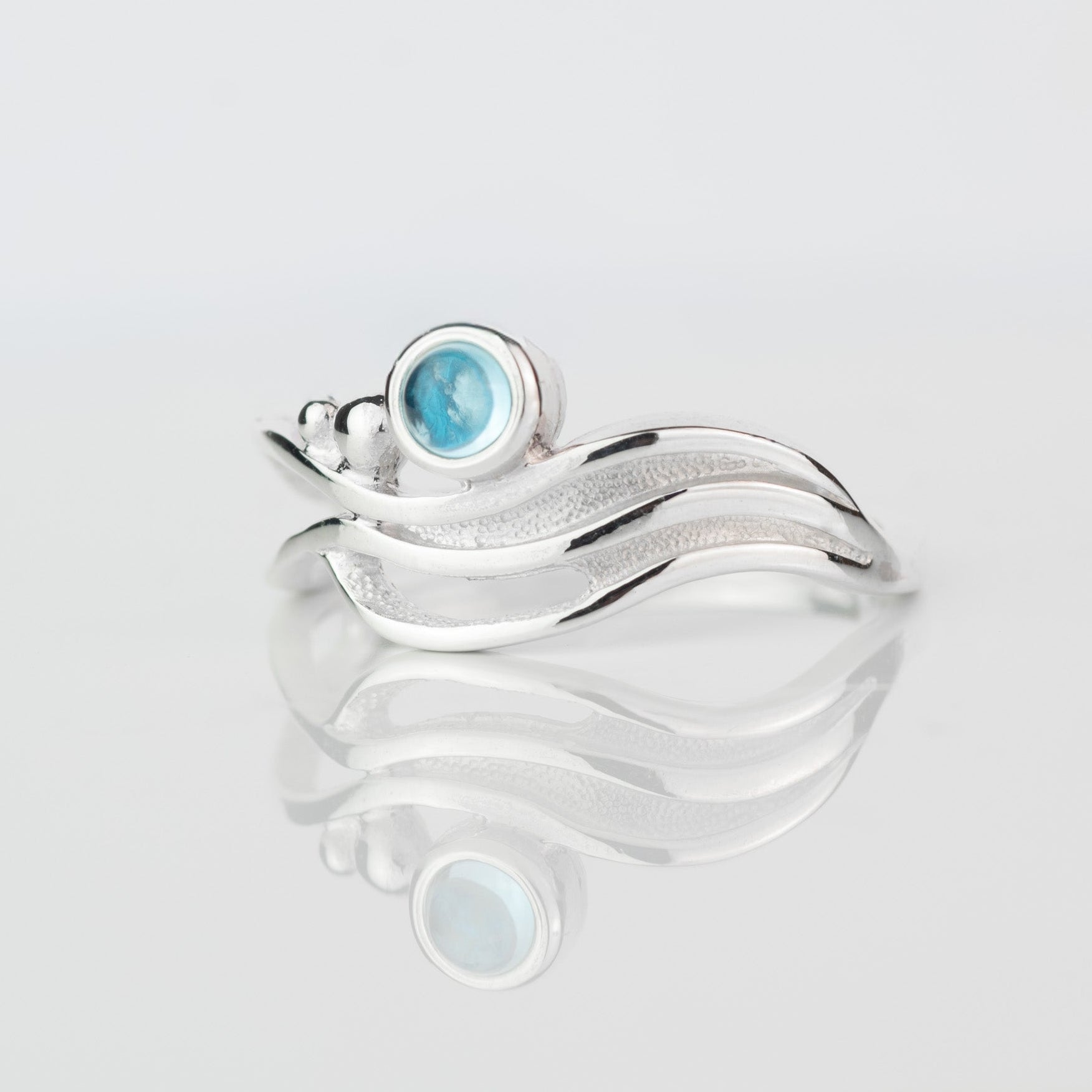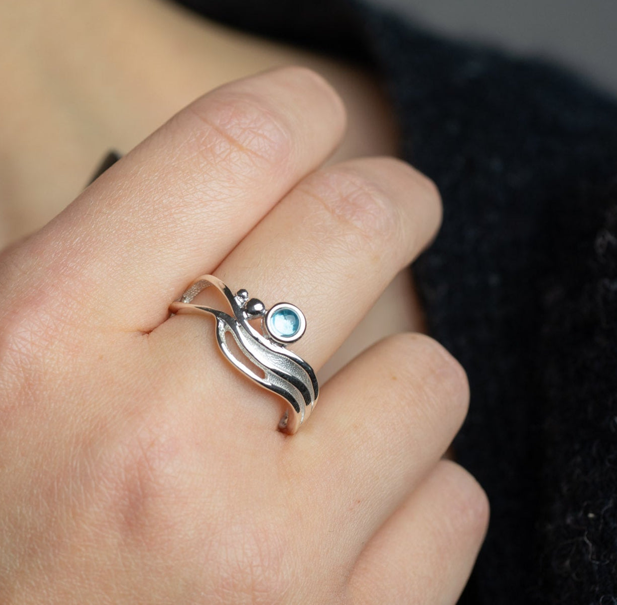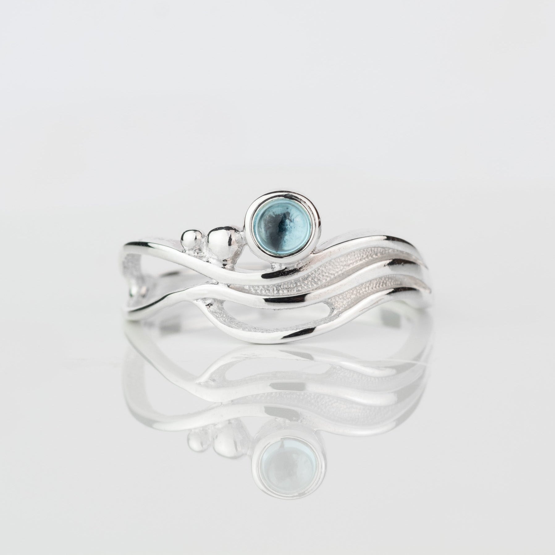 Inspired by the ocean's gentle crescendo, this sterling silver ring captures the journey from whisper to wave. A luminous blue topaz nestles within the undulating band, accompanied by textured pebble details that dance along the curve.