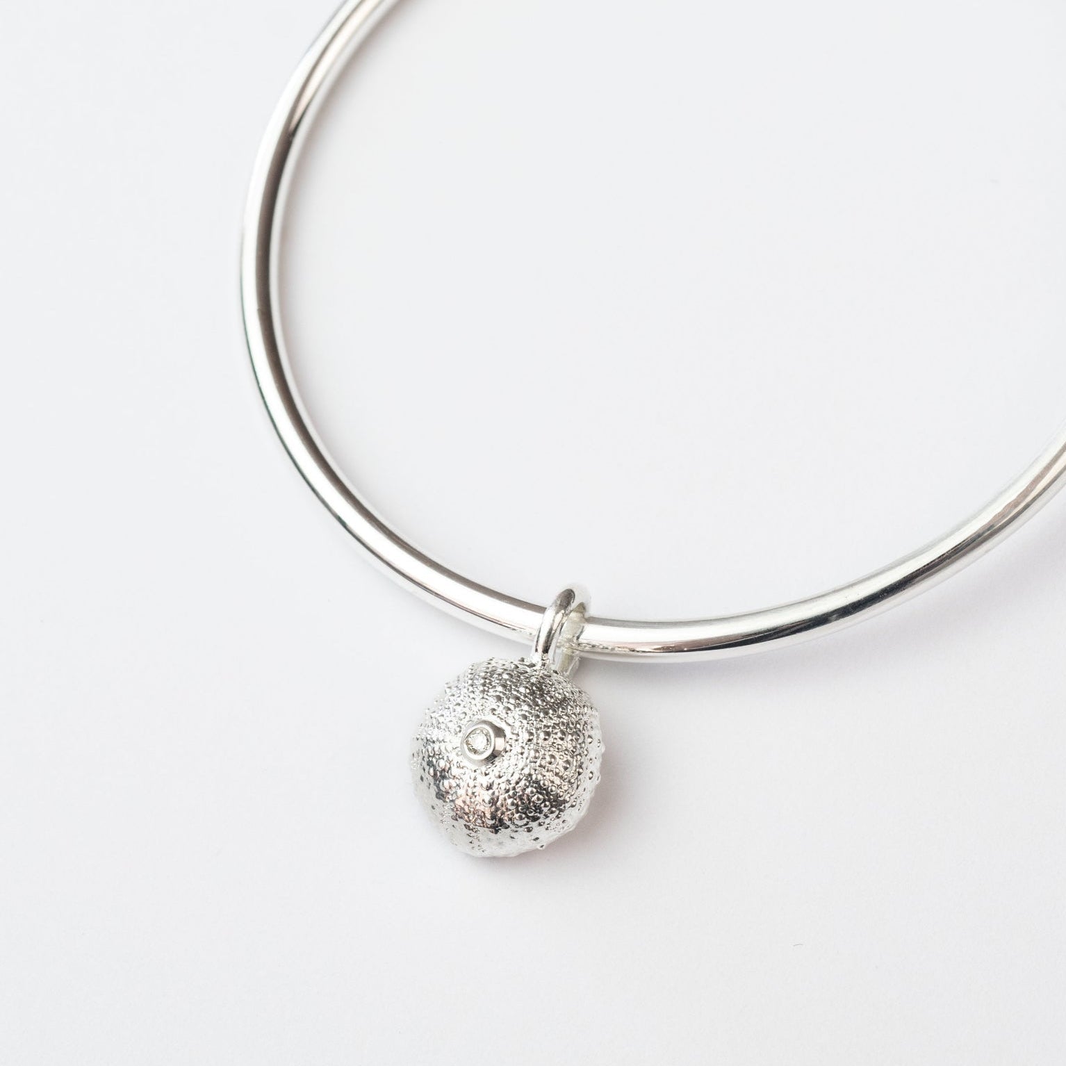 A charming Rockpool Shell Charm Bangle featuring a sea urchin shell collected from Orkney beaches and cast in sterling silver.