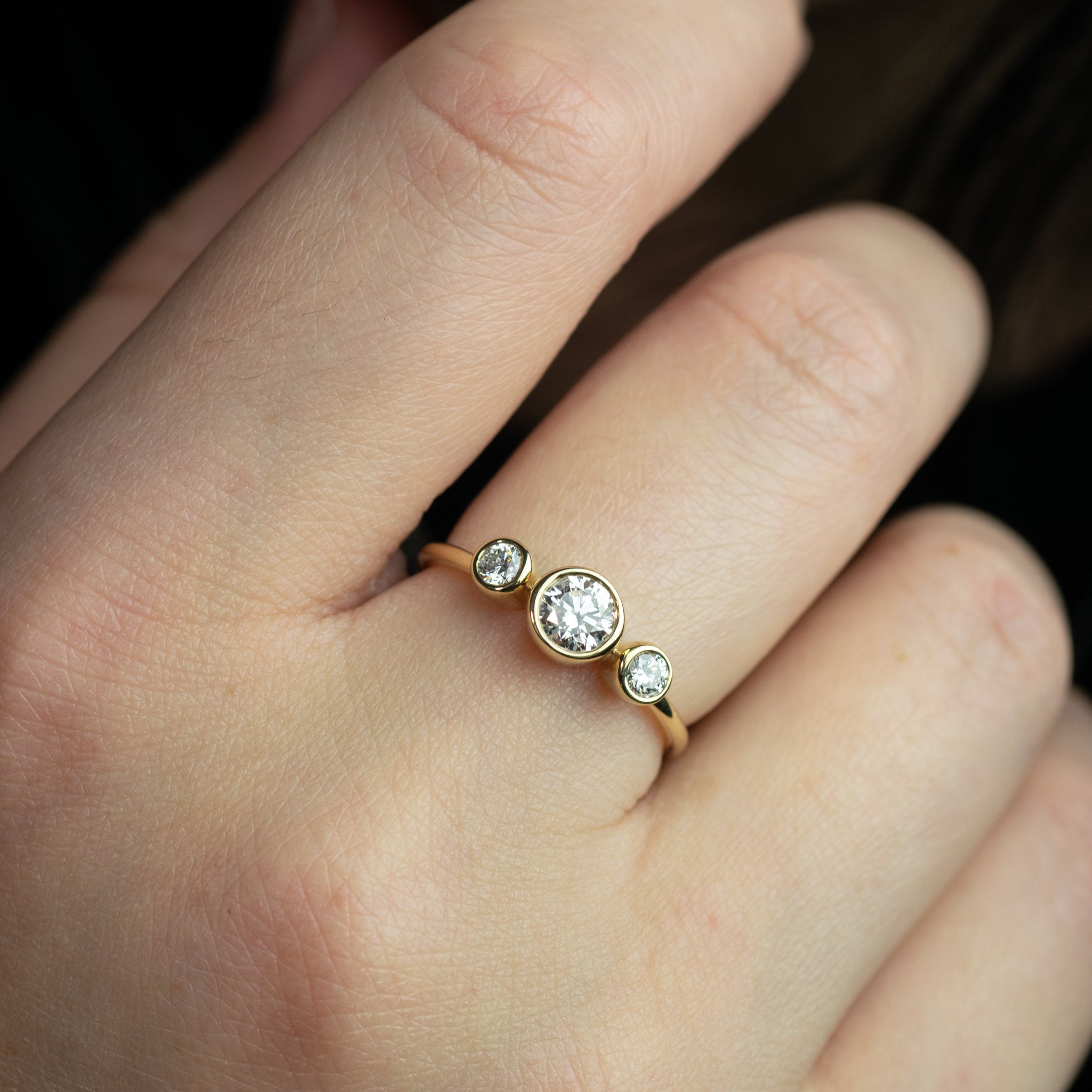 Set in recycled solid 9ct yellow gold, the bezel-set trilogy arrangement symbolises your past, present, and future. The rich, warm gold perfectly complements the clean lines and sculptural appeal of the design, creating a striking statement piece with exceptional sparkle and modern refinement.