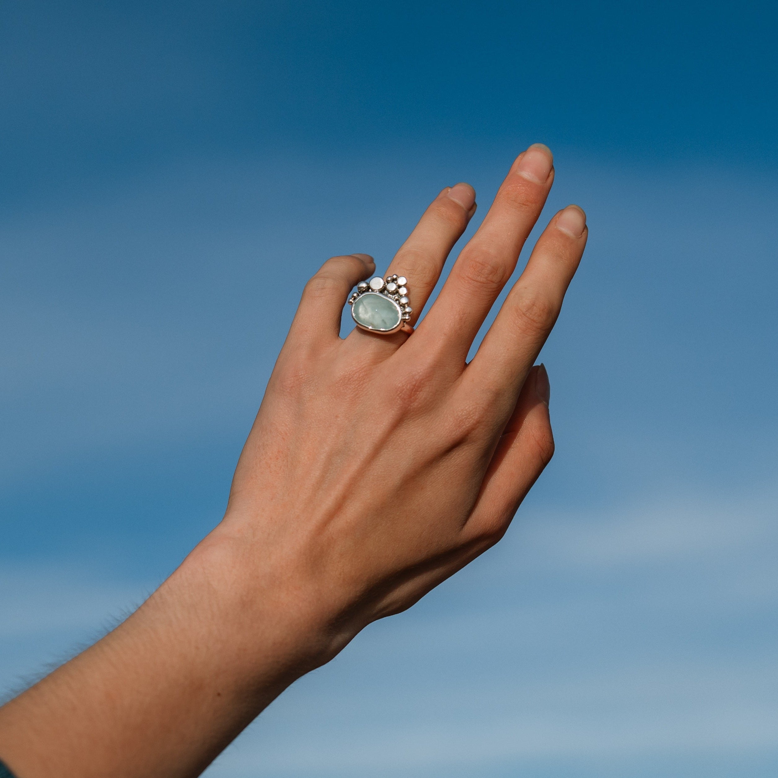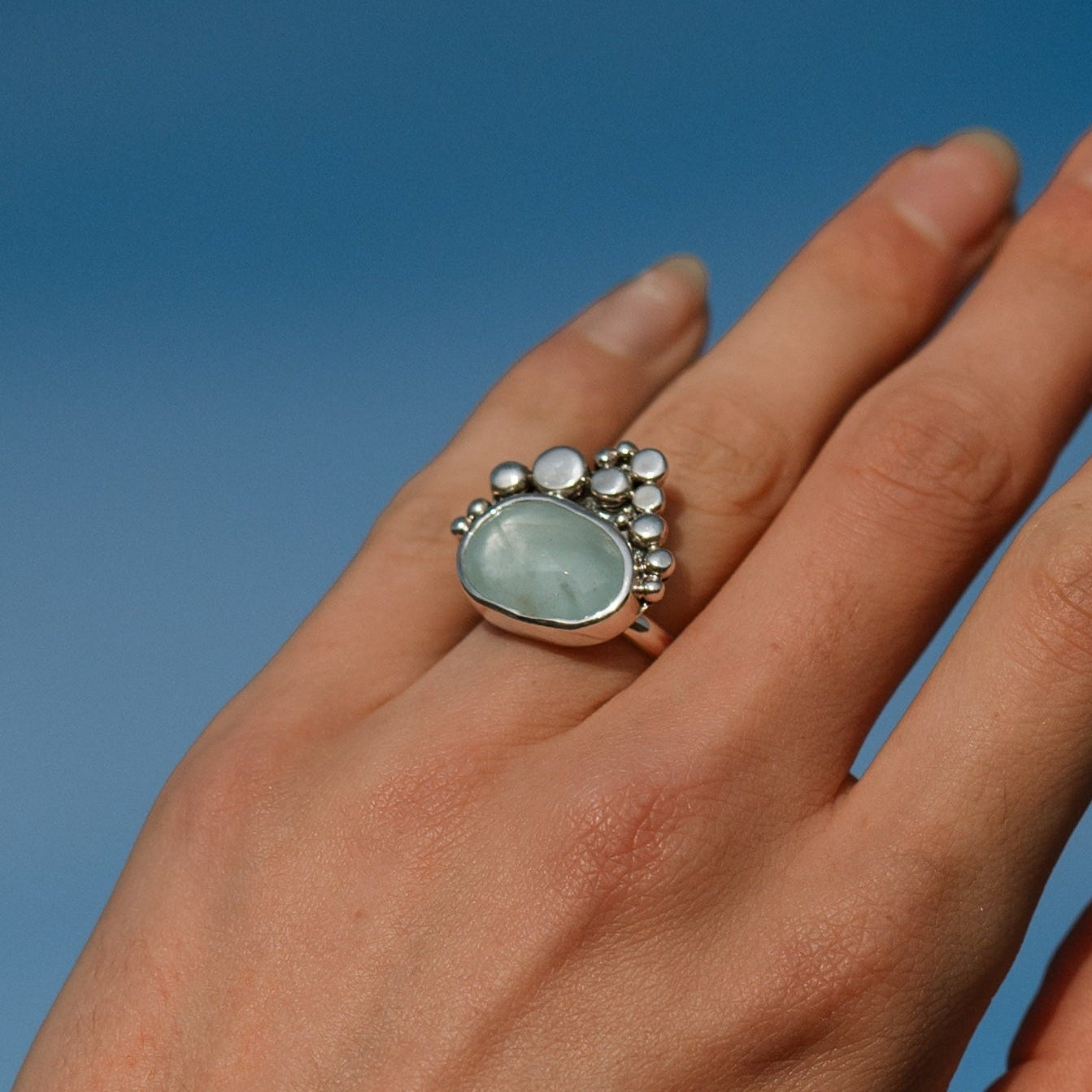 The rose cut aquamarine is surrounded by a sea of silver pebbles. The milky blue gemstone shimmers like the ocean waters.