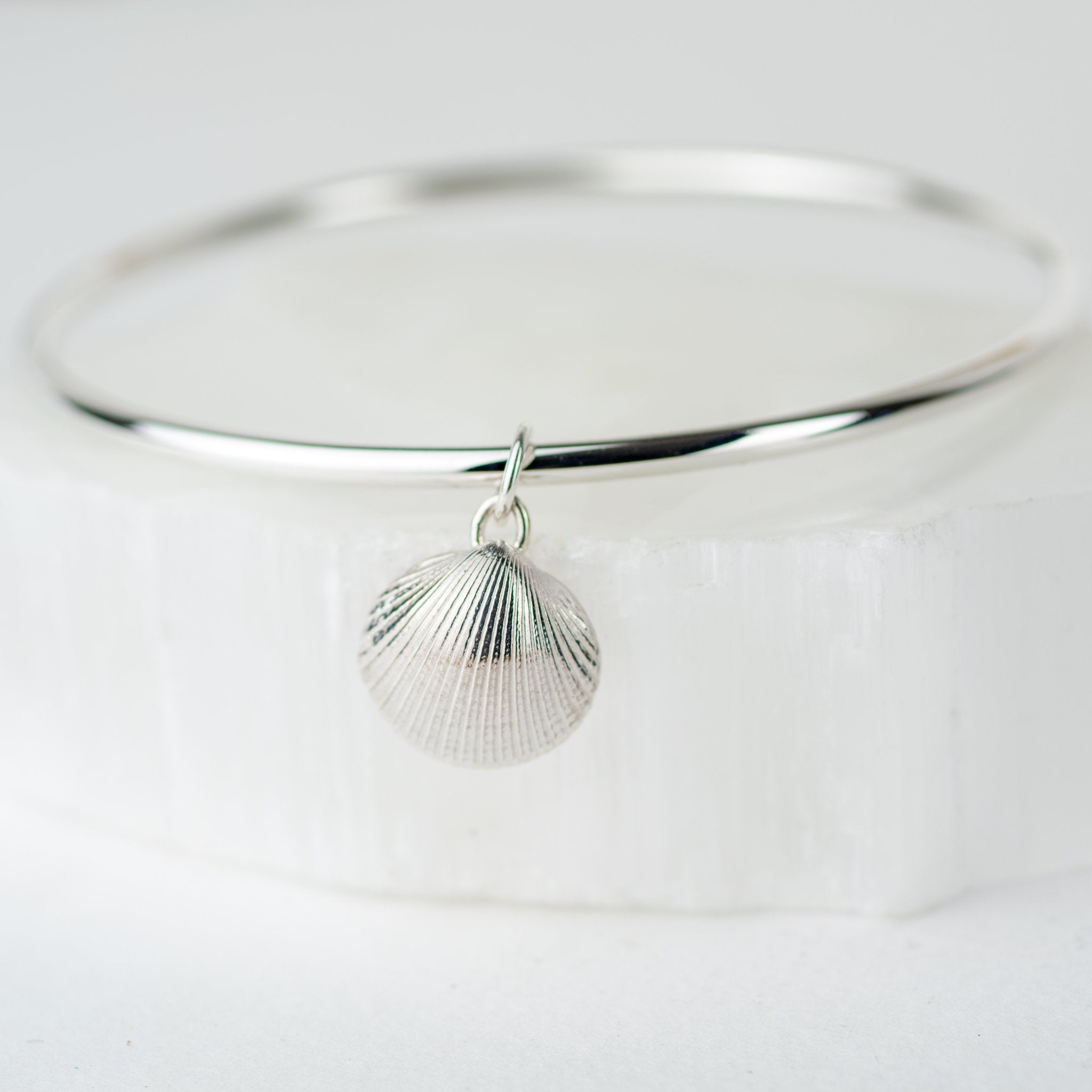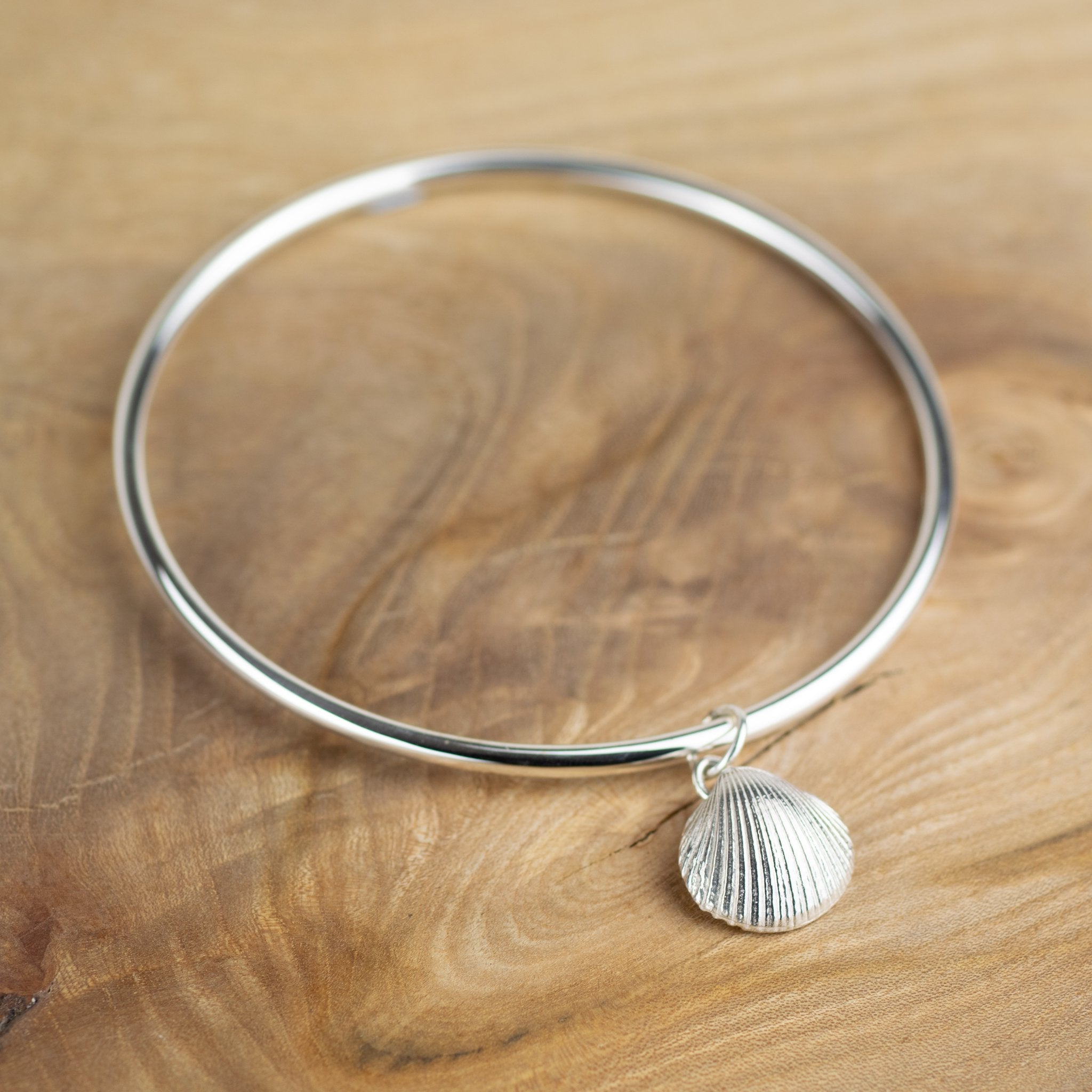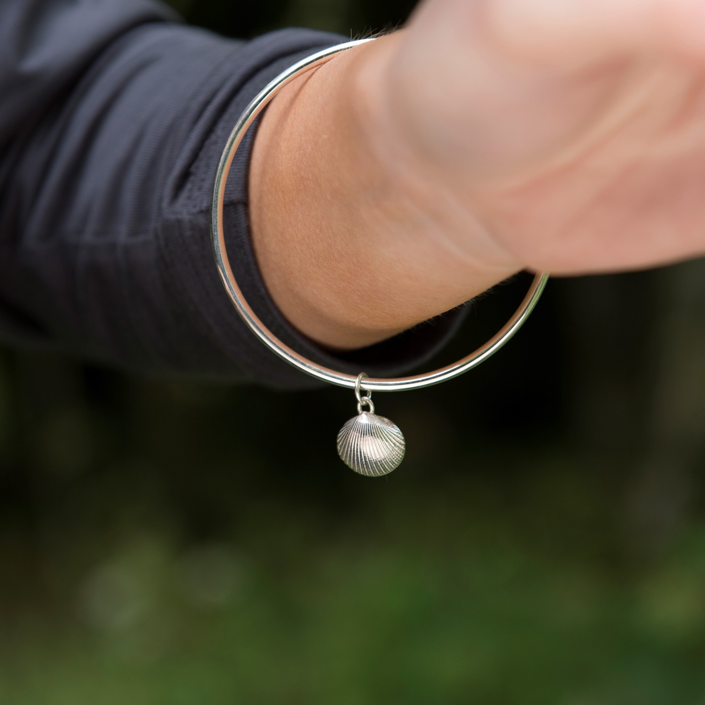 A charming Rockpool Shell Charm Bangle featuring a cockle shell collected from Orkney beaches and cast in sterling silver.