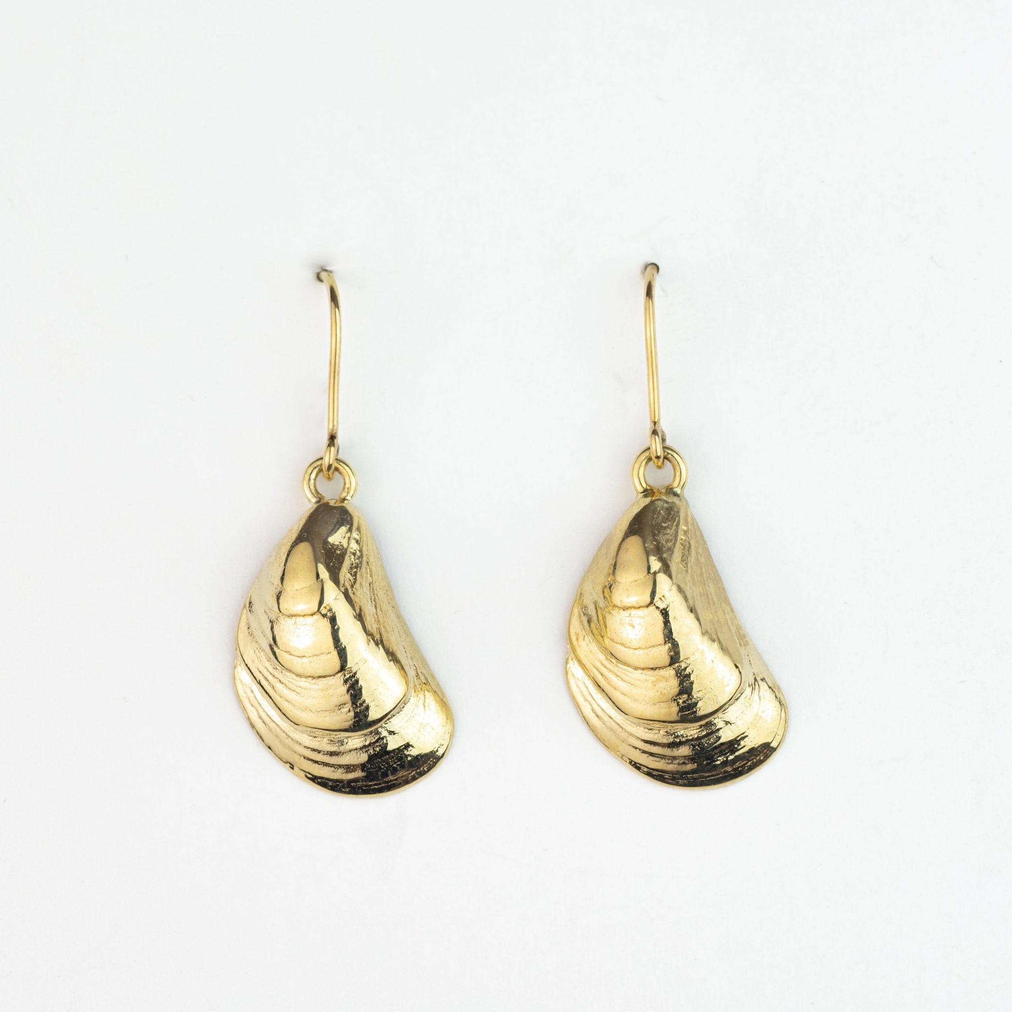 A beautiful and unusual piece of shell jewellery. The Horse Mussel Drop Earrings are crafted in solid 9ct yellow gold.