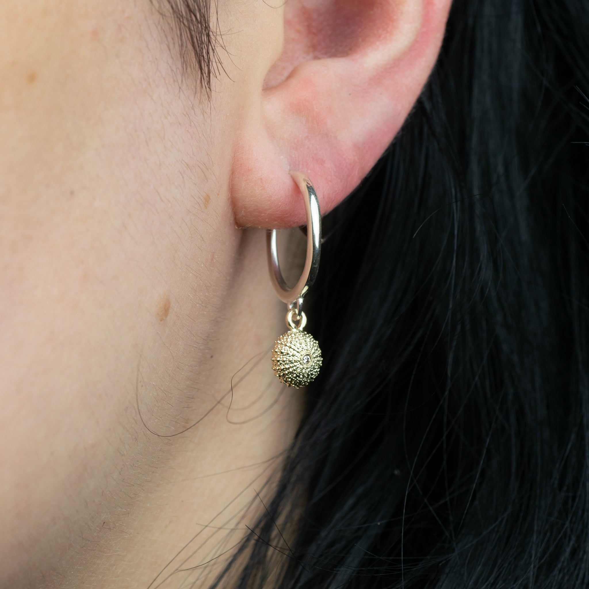 Tiny gold shells, exquisitely detailed, swing gently from classic hoops, bringing a whimsical splash of the seaside to your everyday. Each urchin is set with a shimmering diamond, capturing the sparkle of sunlit waves.