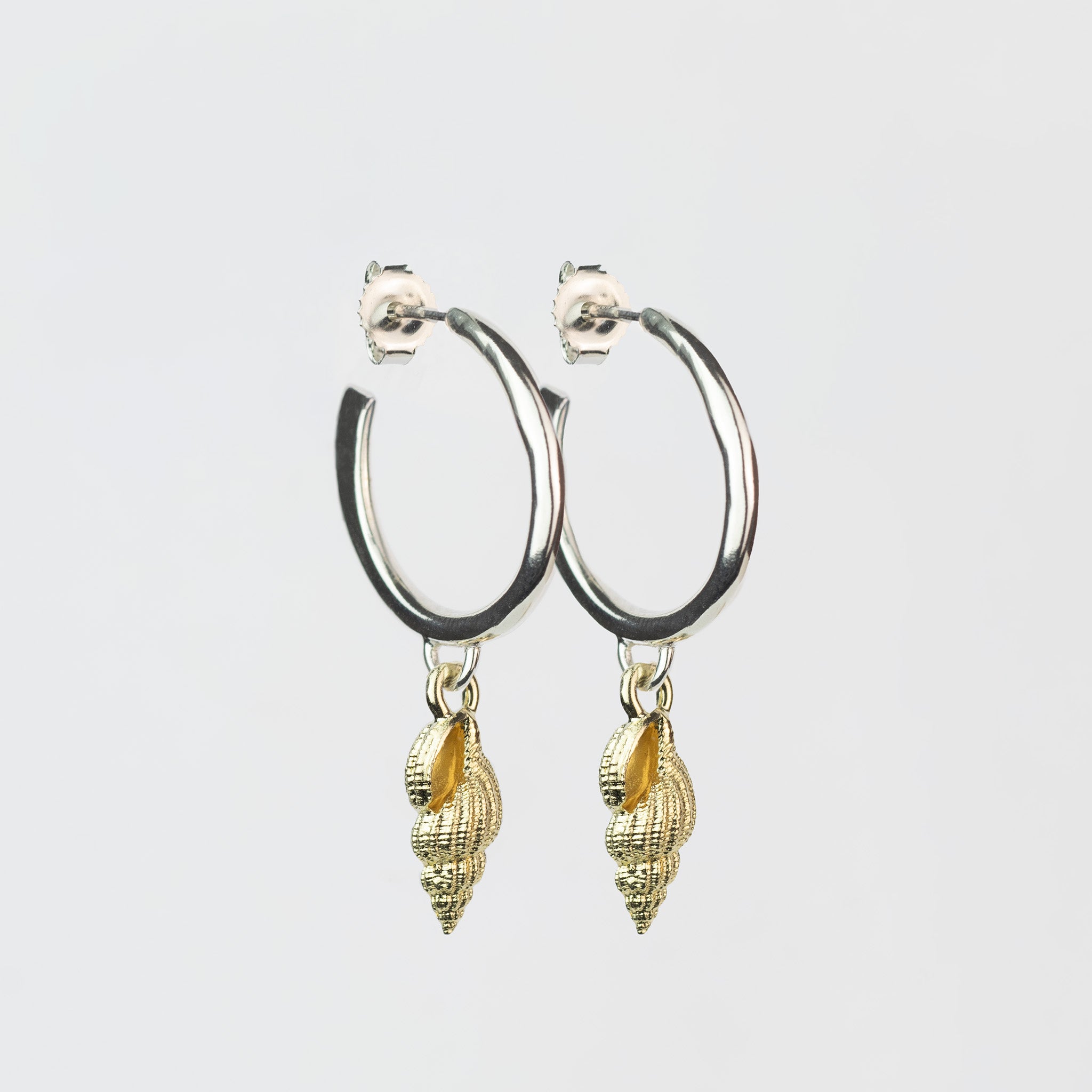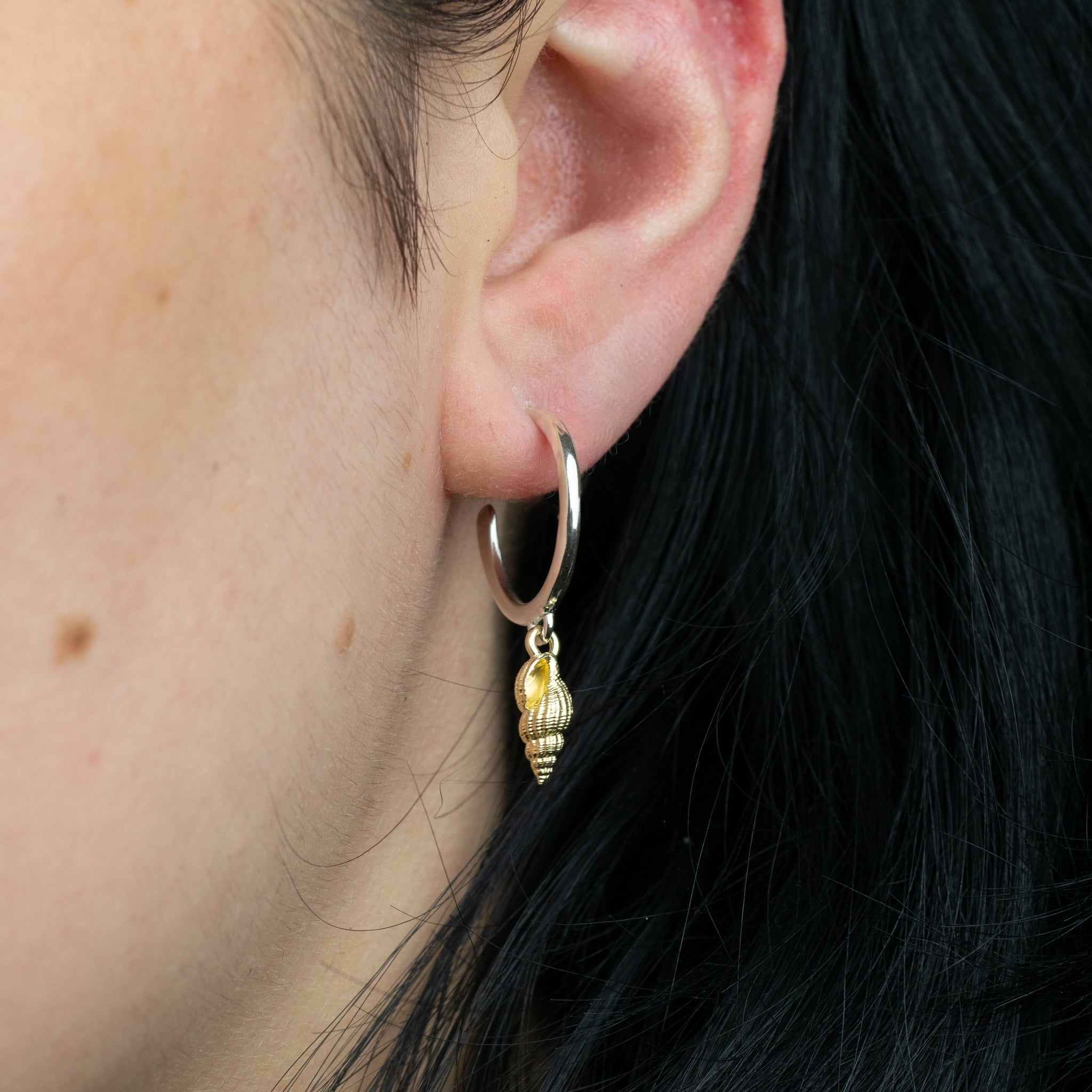 Capture the subtle beauty of the coast with these mixed metal, recycled 9ct yellow gold and sterling silver whelk hoop earrings, featuring delicate shell charms that add a refined, beach-inspired touch. Elegantly crafted, they perfectly balance understated charm and timeless sophistication, making it easy to carry a piece of the seaside wherever you go.