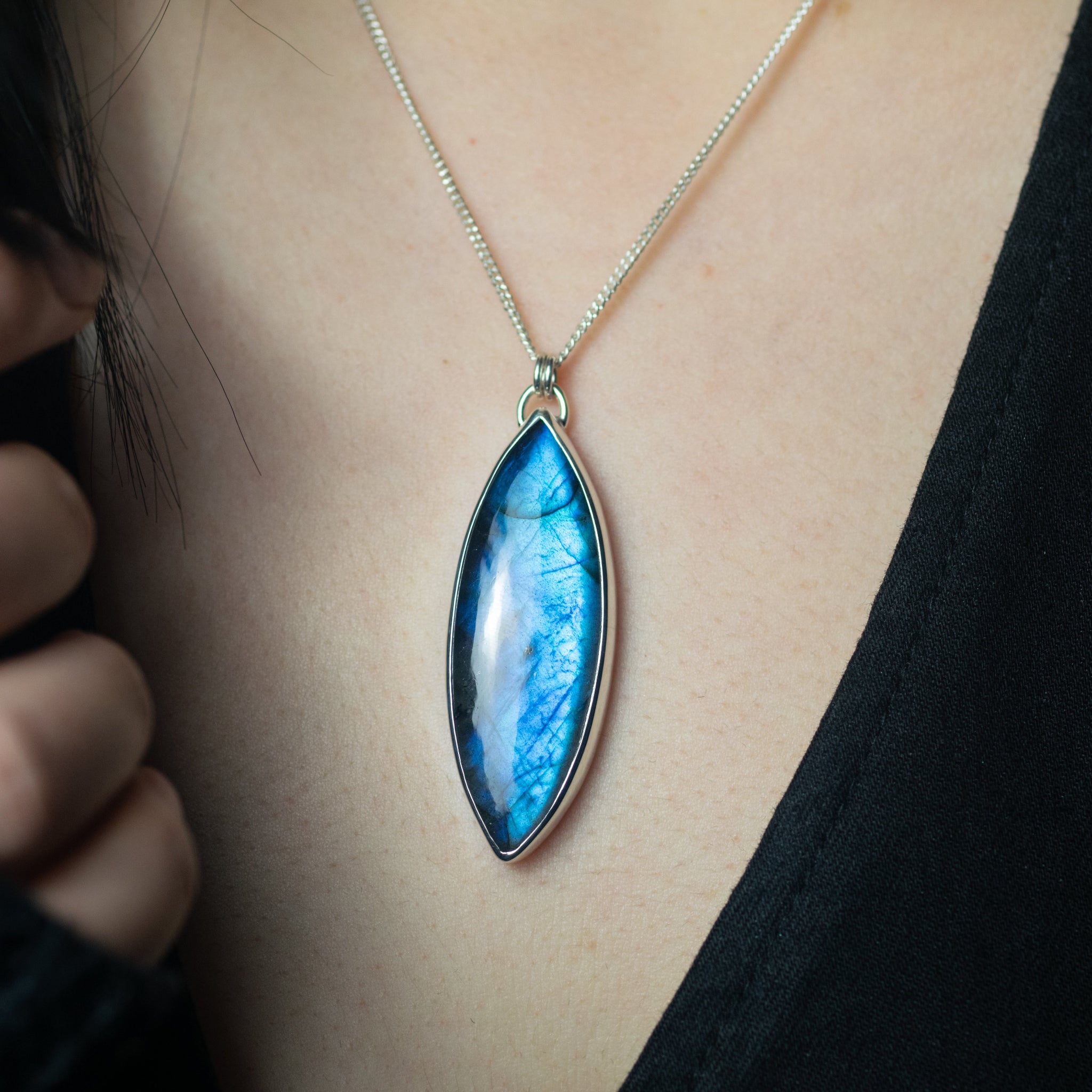 A one of a kind labradorite pendant, beautifully handmade and set with a iridescent blue labradorite gemstone.