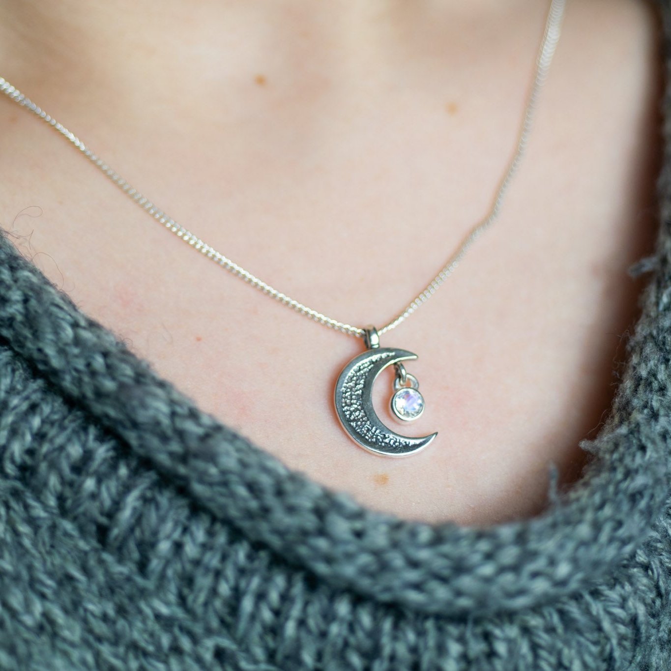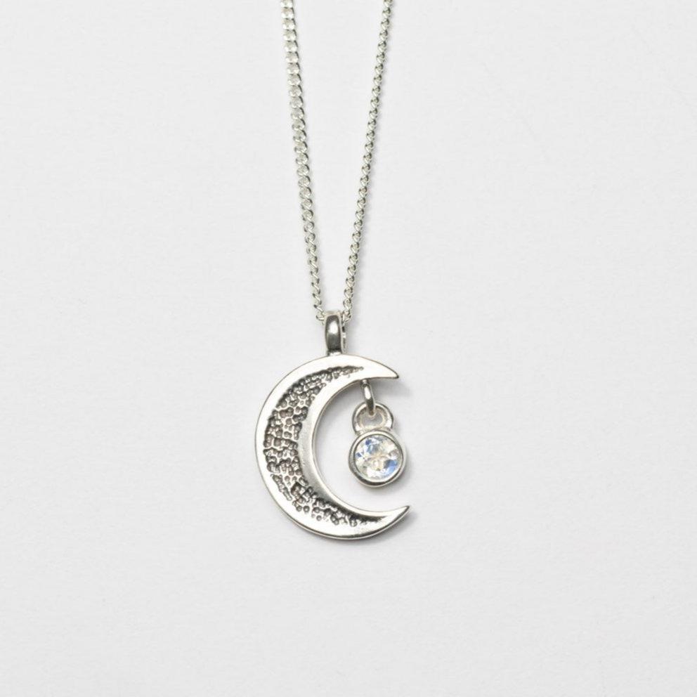 The moon measures approximately 17mm tall and the moonstone 4mm wide. Choose from a range of sterling silver chain lengths.