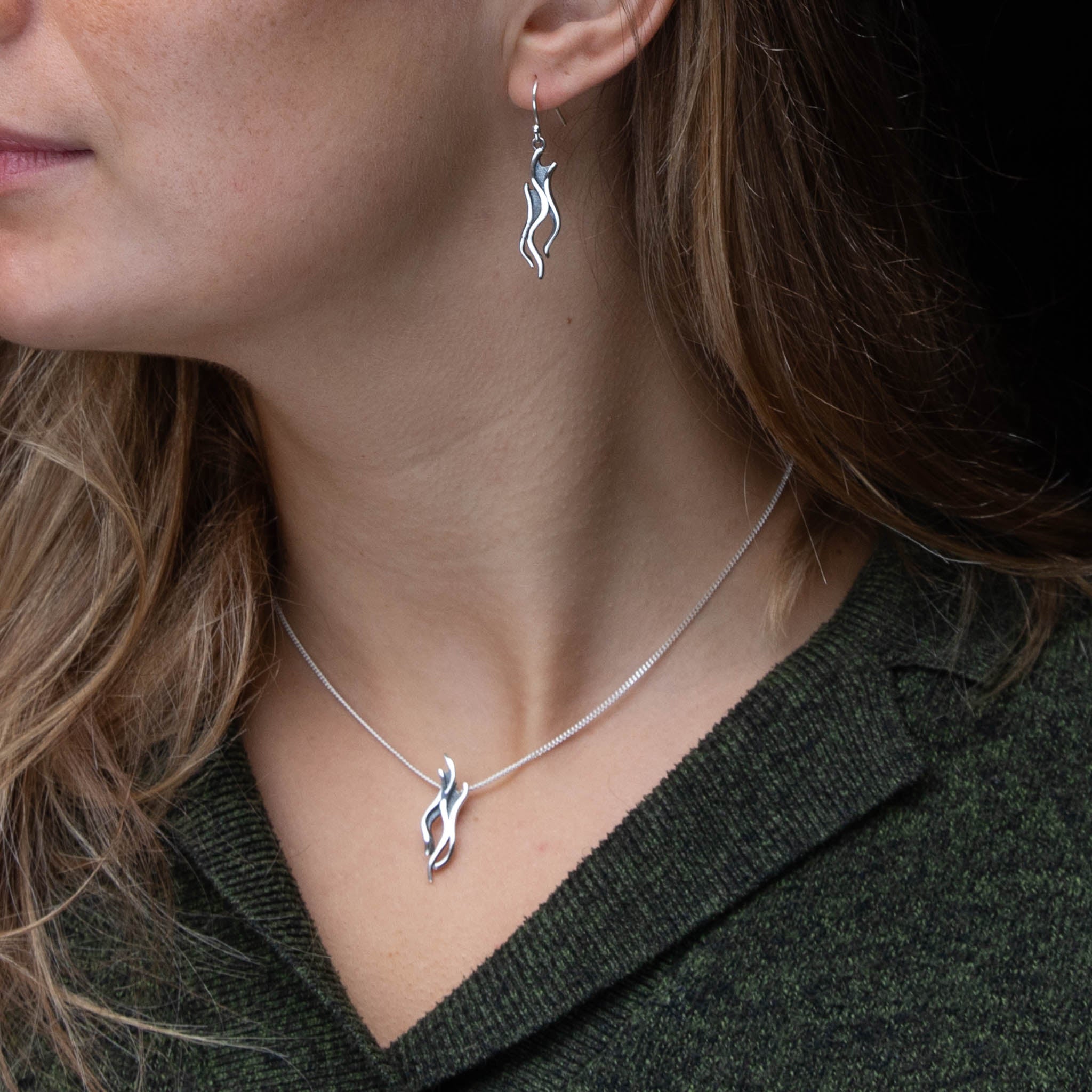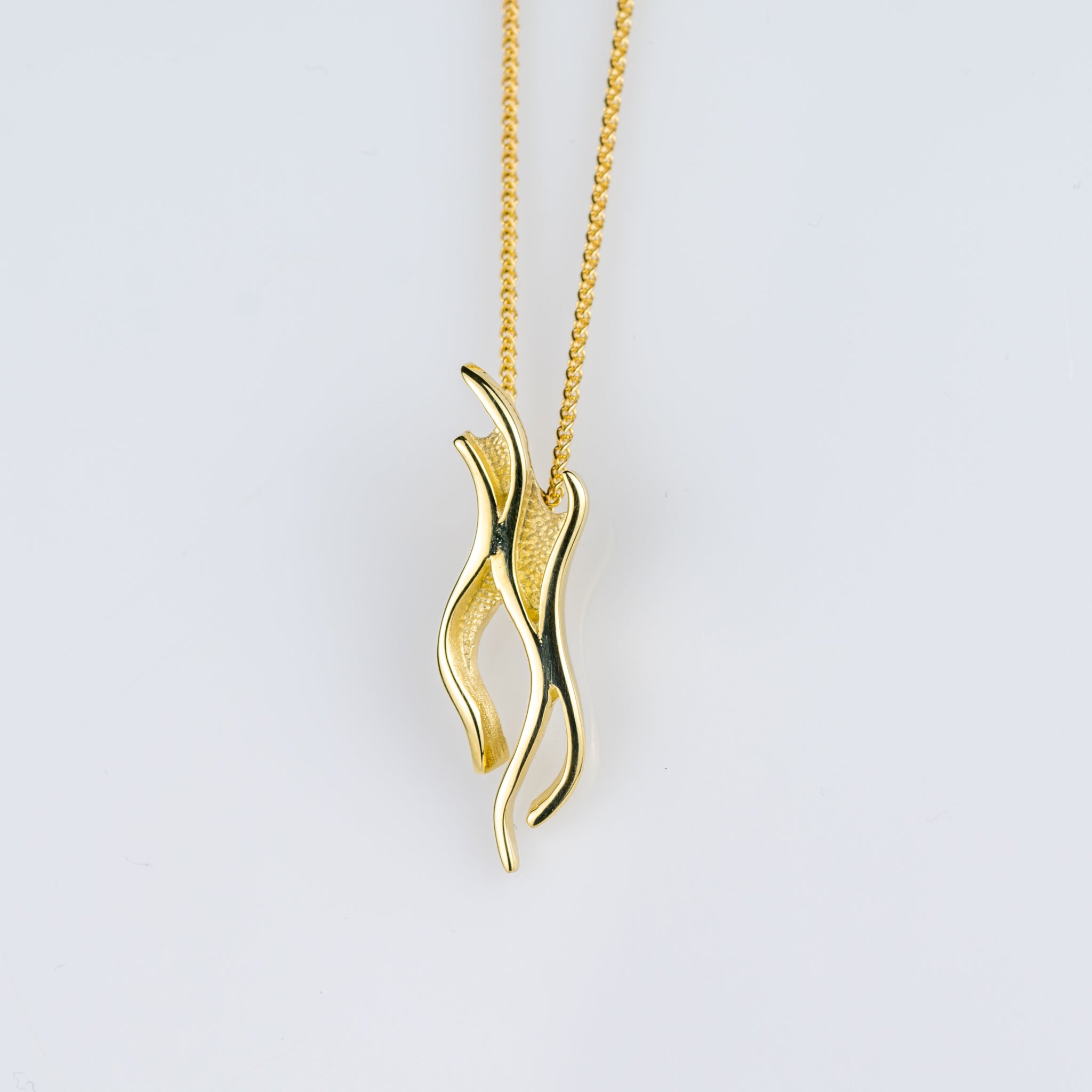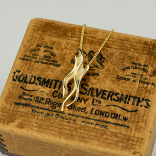 The dainty gold Dancer pendant is crafted with recycled solid 9ct yellow gold. In a wave pattern, it evokes the shimmer of the 'merry dancers,' creating a stunning piece of jewellery.
