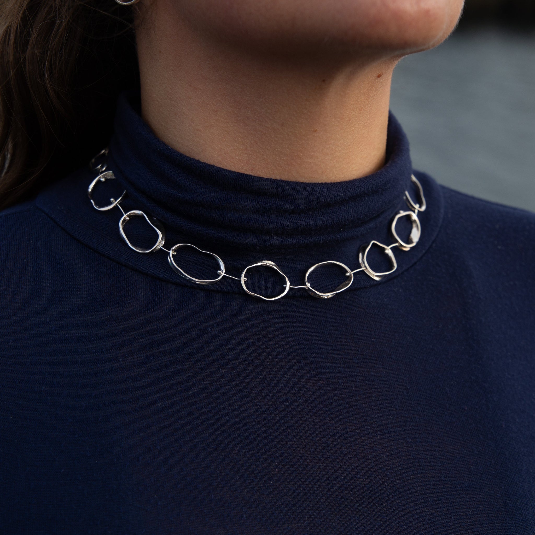The Glimmerings necklet is a tactile sterling silver piece that moves beautifully. It is fastened with a toggle clasp.