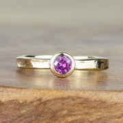 Made from solid 9ct or 18ct yellow gold, fully hallmarked. Set with a genuine faceted pink sapphire.