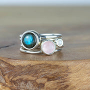 A set of five handmade gemstone stacking rings featuring labradorite, rose quartz and rainbow moonstone gemstones.