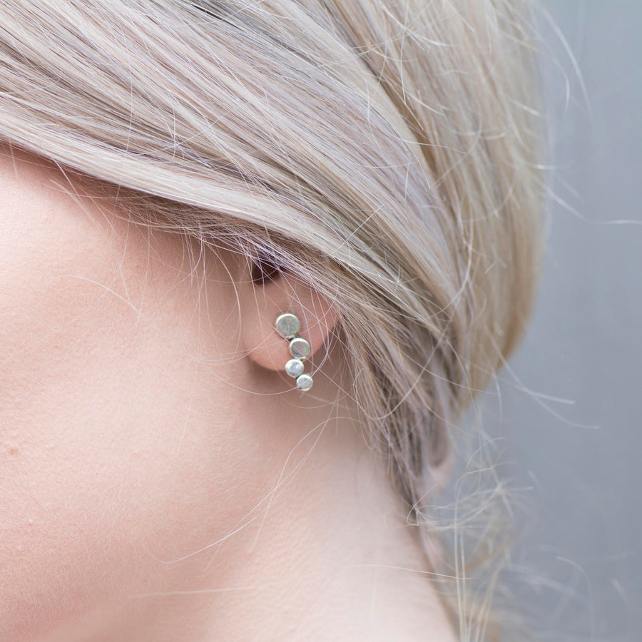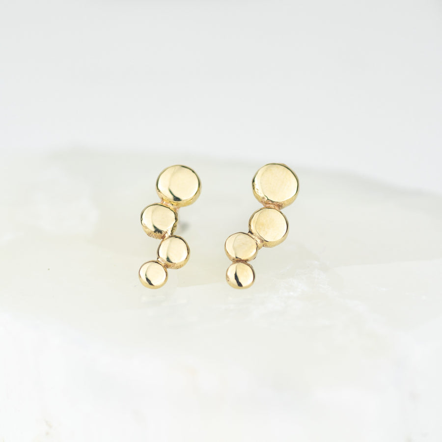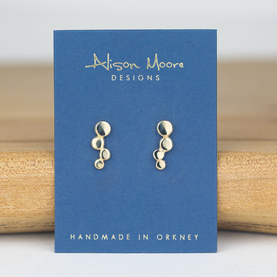 These solid 9ct gold earrings were inspired by the sea tumbled pebbles found on the stunning beaches found here in Orkney. They consist of four cascading pebbles. The studs are secured with a butterfly scroll back.