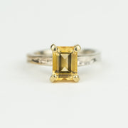 Inspired by a love of literature and the tactility of well-loved leather books this ring features a textured recycled sterling silver Storybook band and a crisp emerald cut rich citrine clutched by solid 9ct yellow gold.
