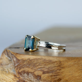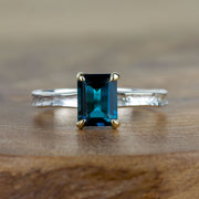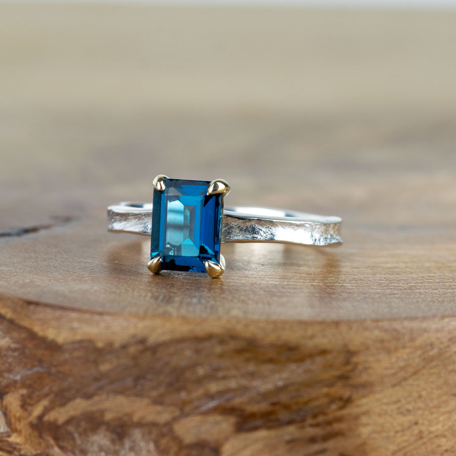 Inspired by a love of literature and the tactility of well-loved leather books this ring features a textured recycled sterling silver Storybook band and a crisp emerald cut london blue topaz clutched by solid 9ct yellow gold claw setting.