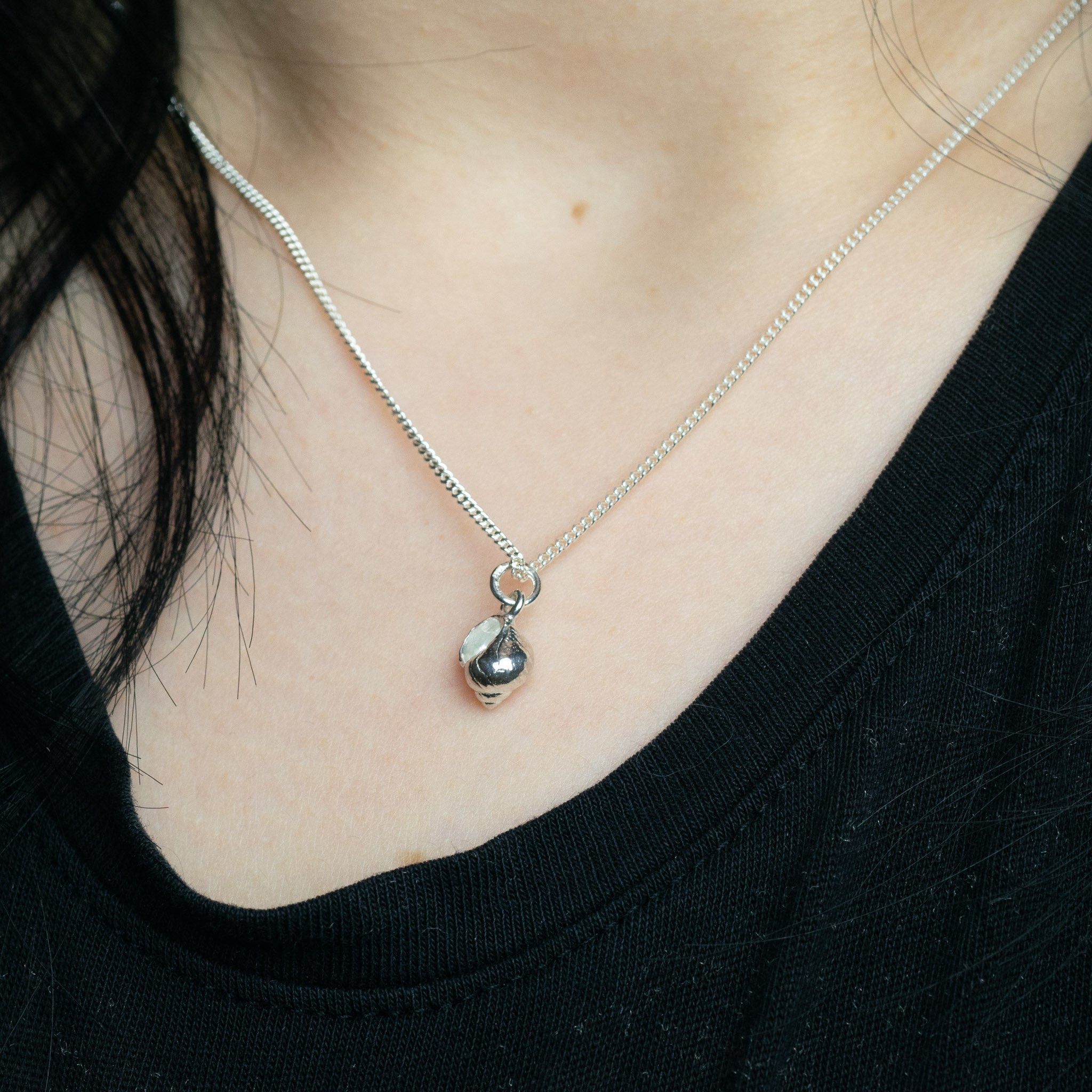 A beautiful Whelk Shell Pendant, made using a found shell from an Orkney beach and cast in solid sterling silver. This lovely simple pendant hangs from a silver chain and makes a wonderful gift for beach lovers.