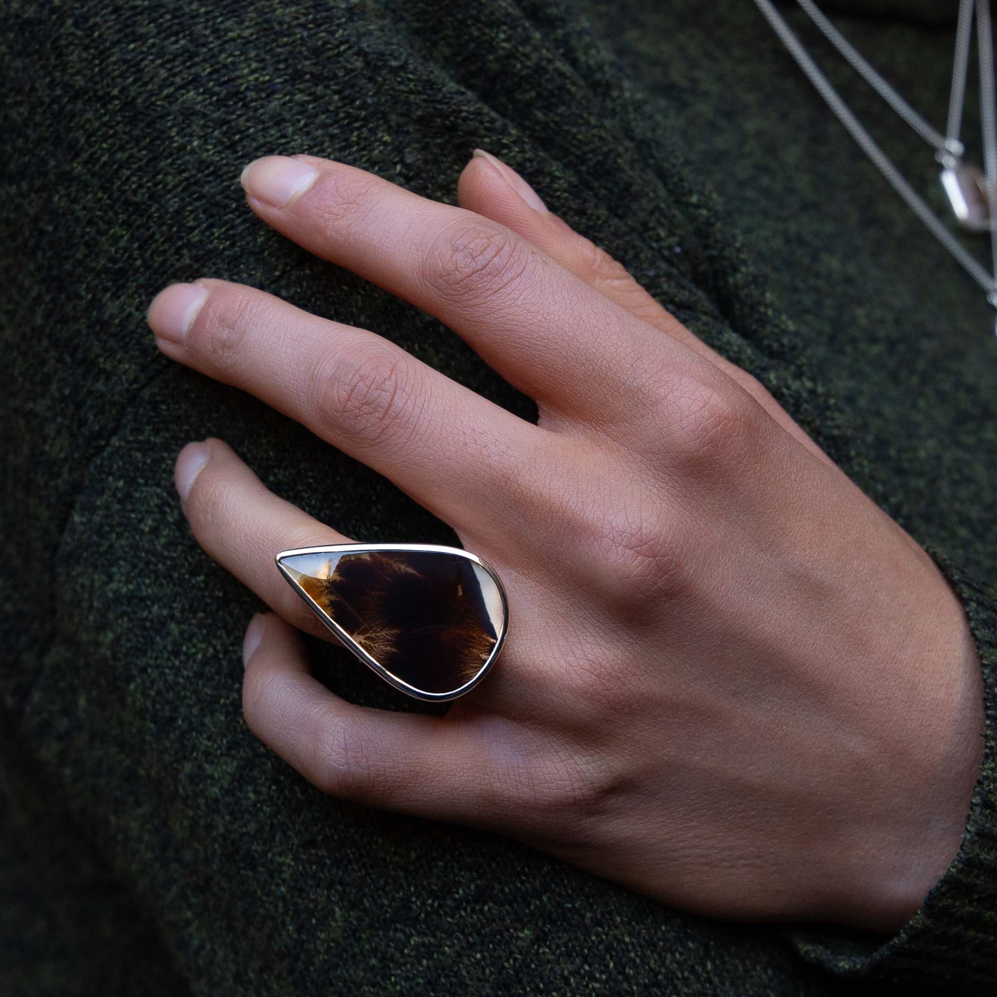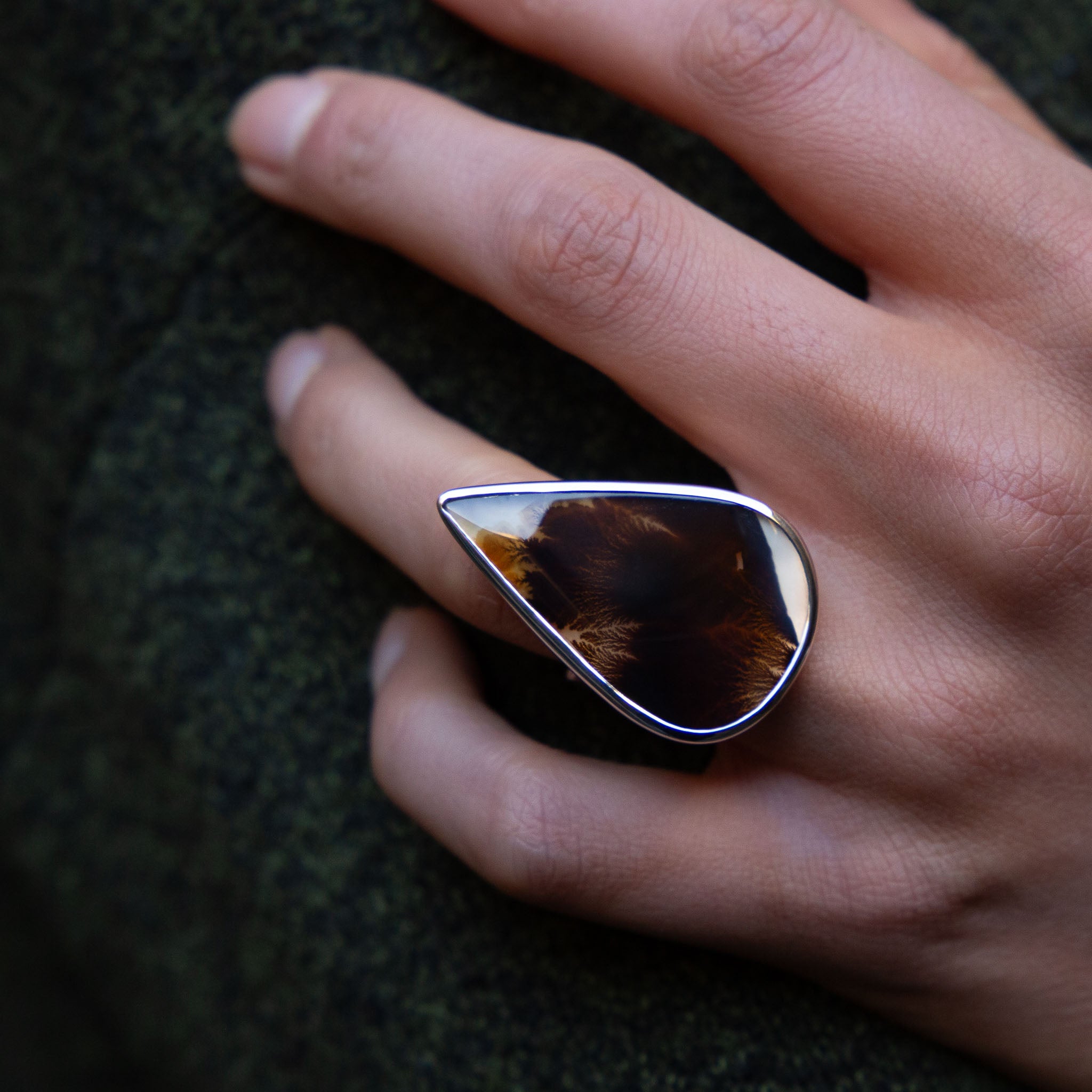 The dendritic agate measures 36mm x 23mm, and the band 7-8mm wide. This is a one of a kind ring in size K 1/2, can be increased to L upon request.