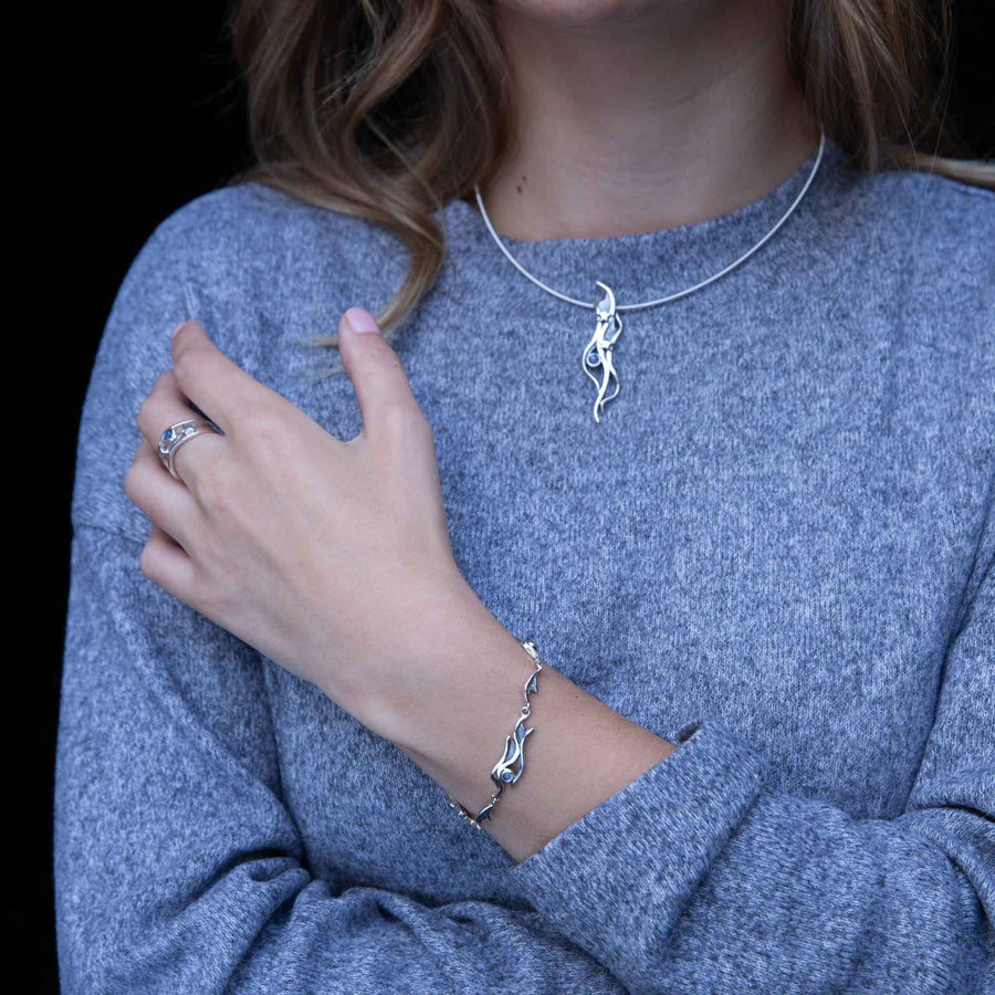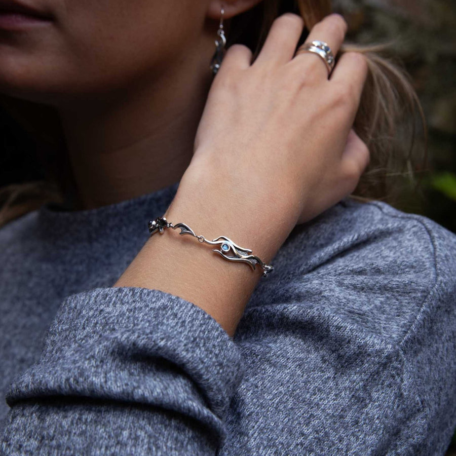The Northern Lights Dancer bracelet reflects the dancing Northern Lights in the dark Orkney night skies, with colour captured in the labradorite gemstones. Its creation was inspired by the magical Northern Lights night sky, full of light, movement and colours which are celebrated on our islands.