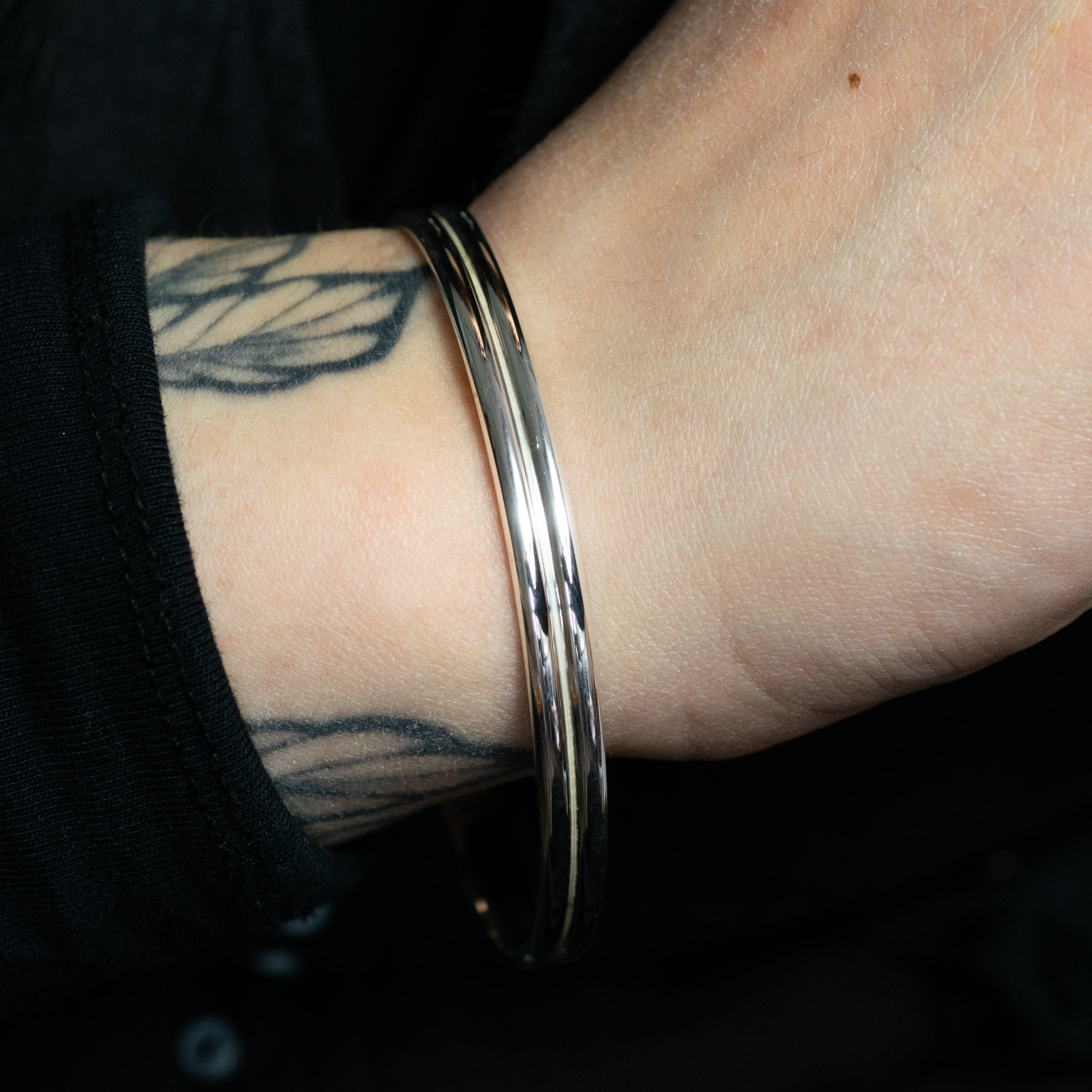 A lovely, heavy solid sterling silver handmade bangle, designed to give the illusion of a stacked set.