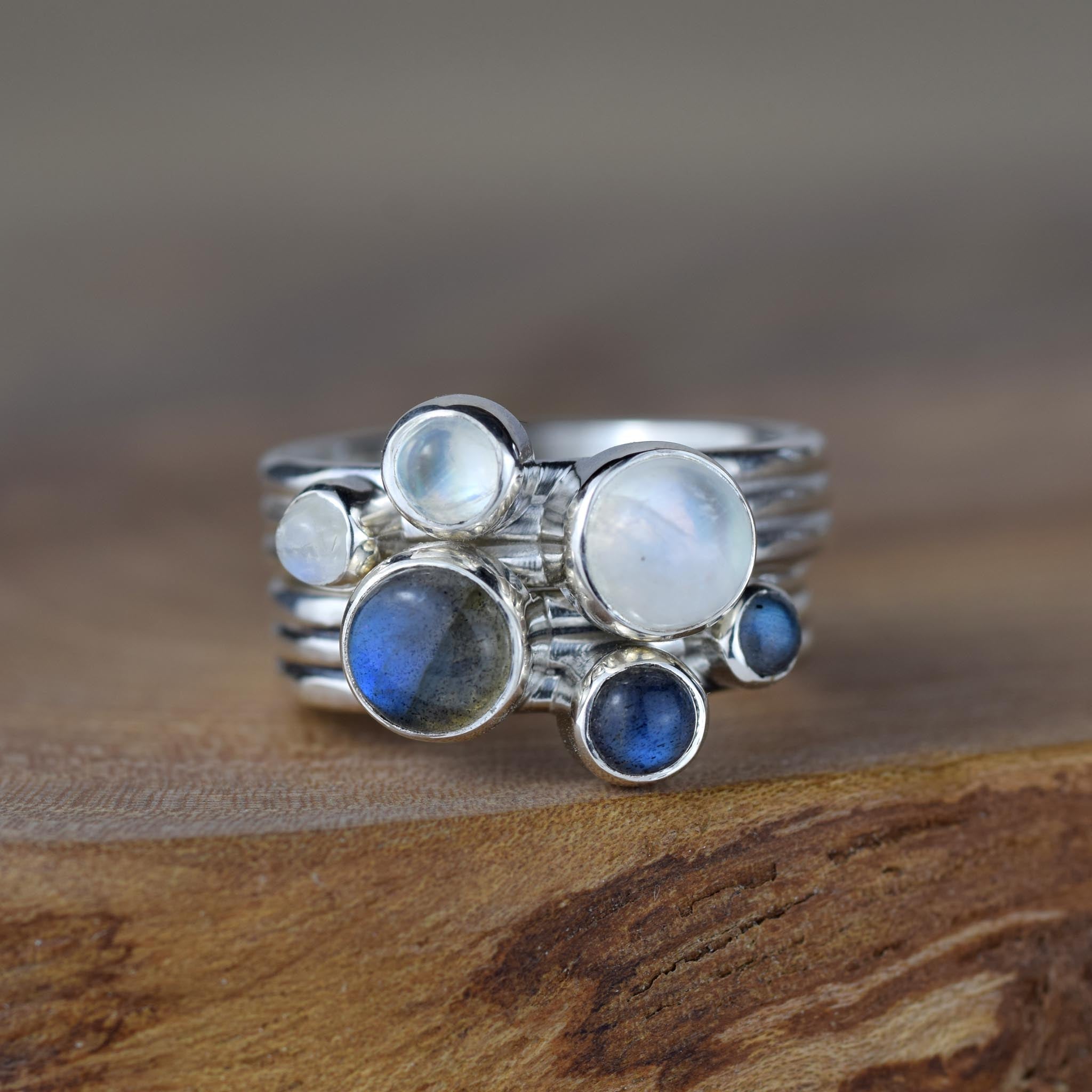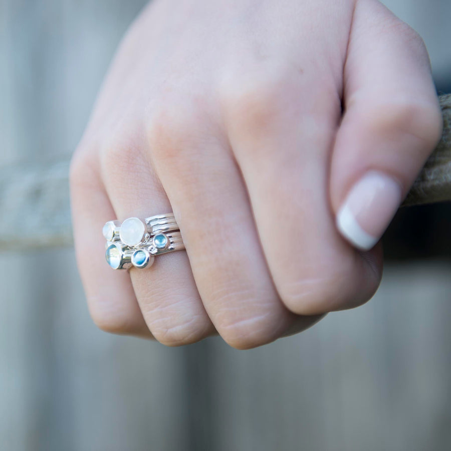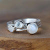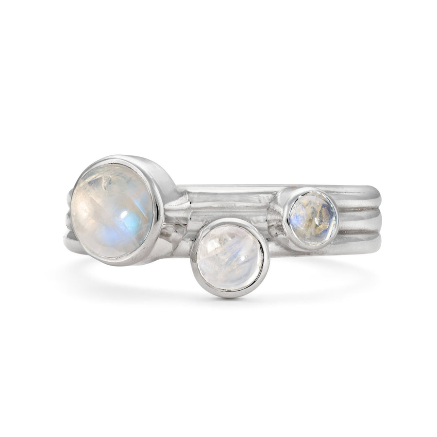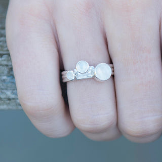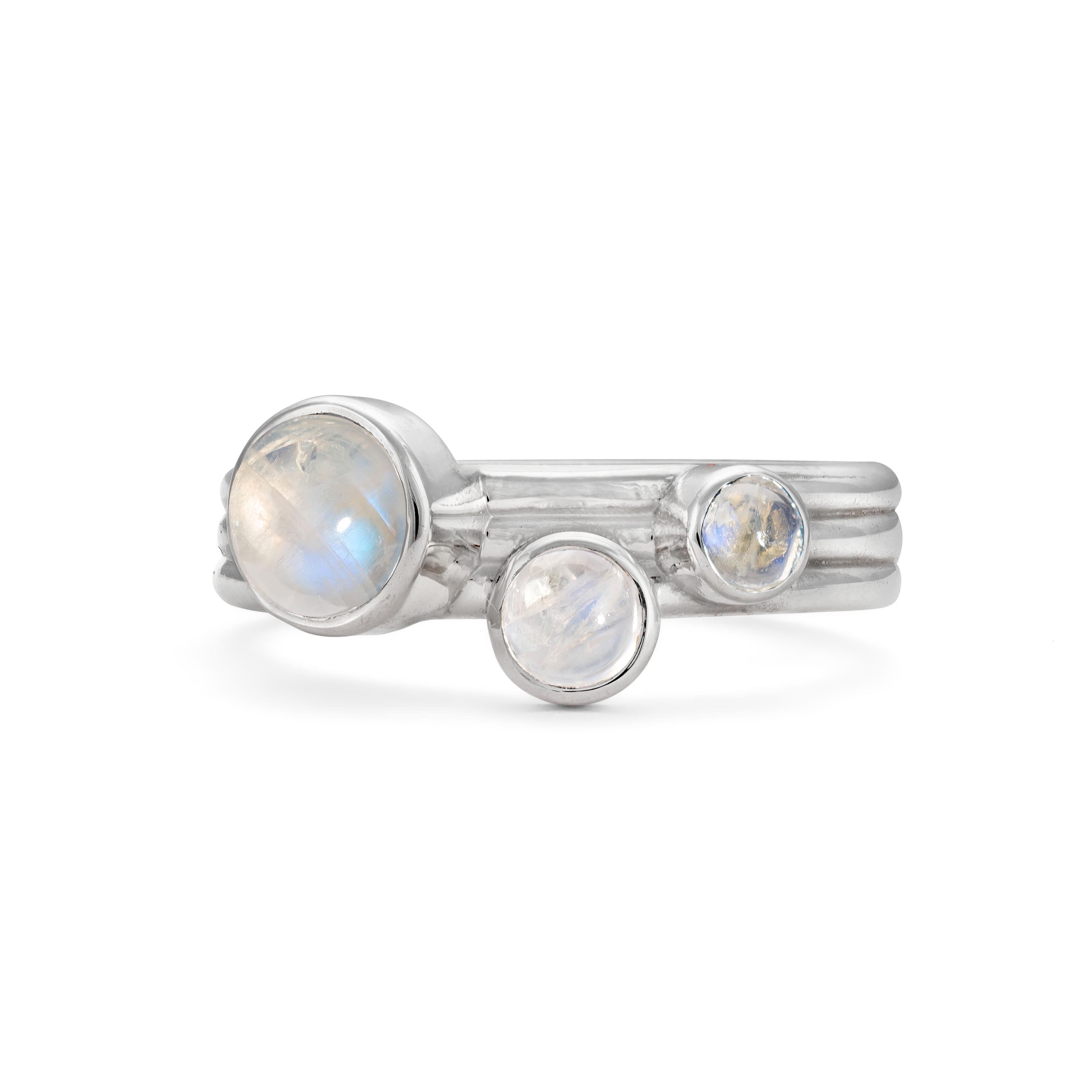 The Snowdrift combination of gemstones comprises of three white moonstone cabochon cut gemstones, set upon a solid sterling silver band. This beautiful stone shows flashes of blue as light bounces of the surfaces within making each stone and ring entirely unique.